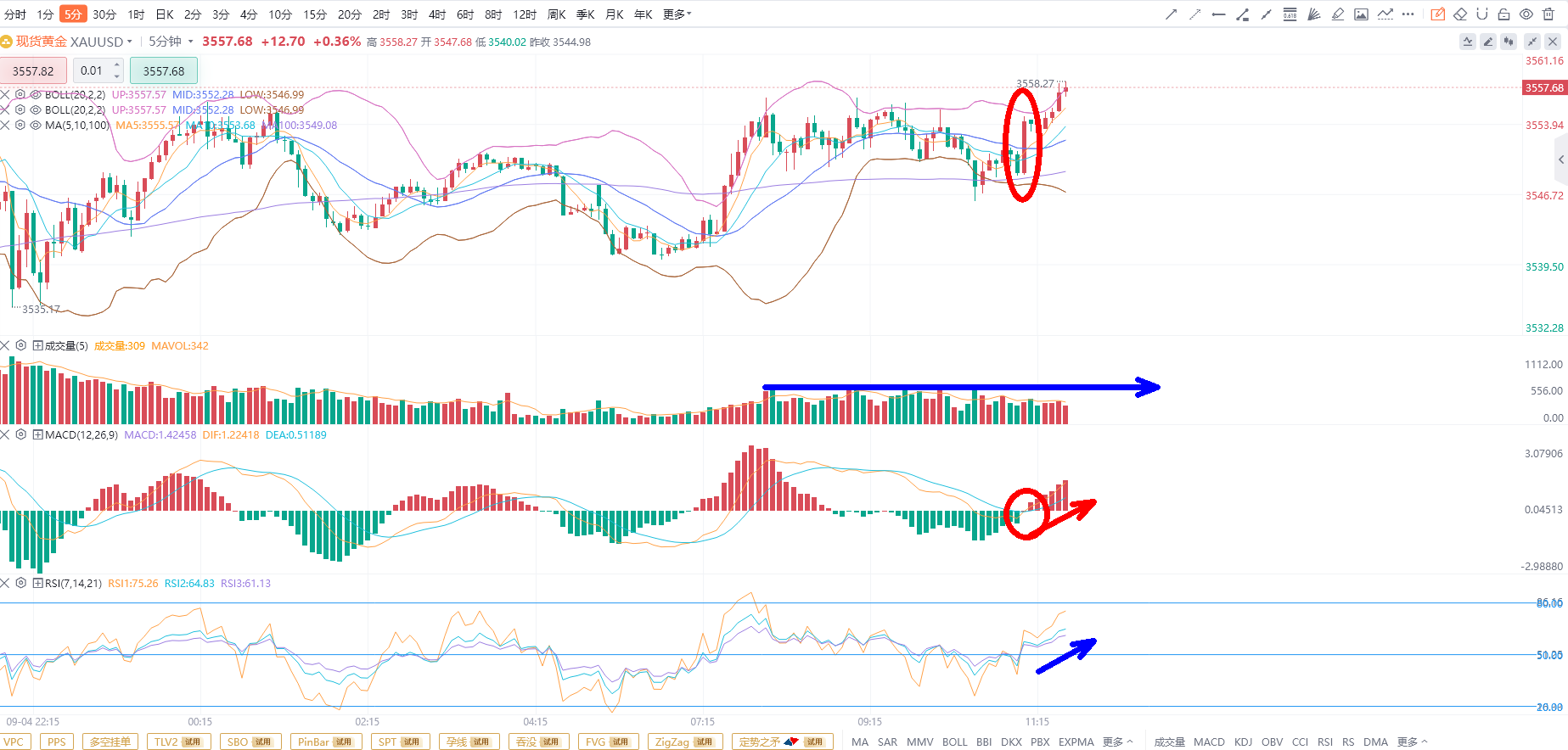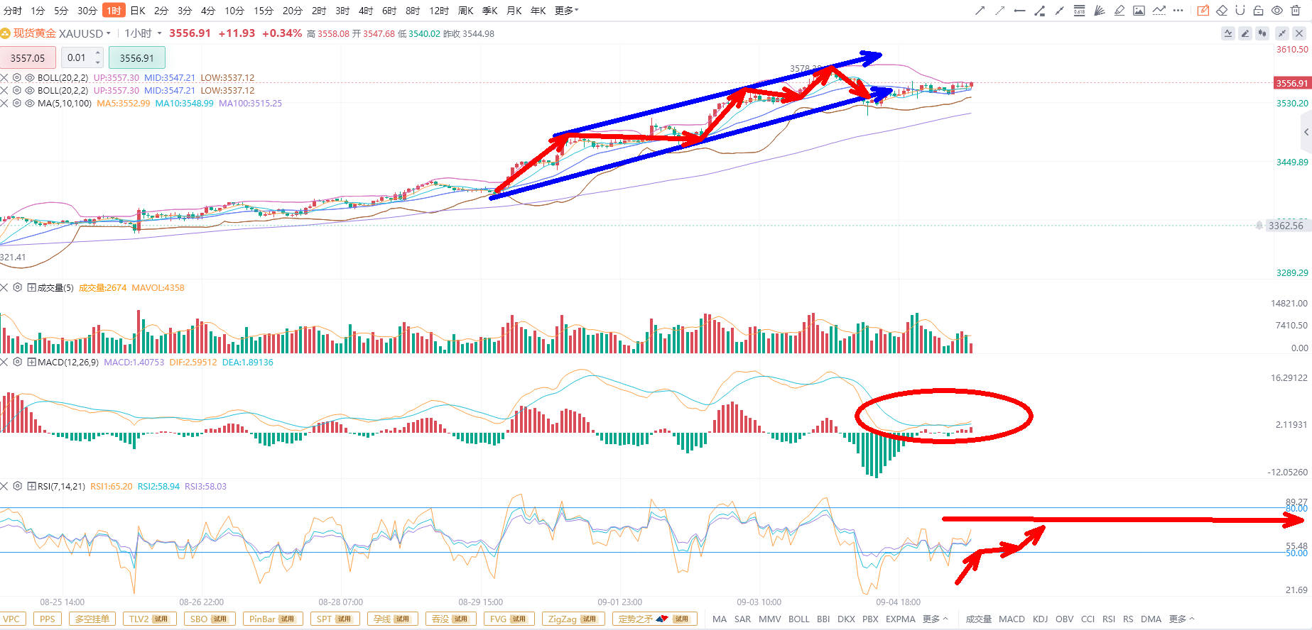 黄金1小时黄金价格进入震荡,在下轨支撑位附近3548变化,今晚上的非农数据公布之前,黄金都是在震荡期间,不好做单子进场,今日成交量减少到5000左右,现在多头势力都是在蓄力等候,macd出现快慢线粘合,动能释放不强,rsi价格线往70超买区前进,多头势力占据市场。