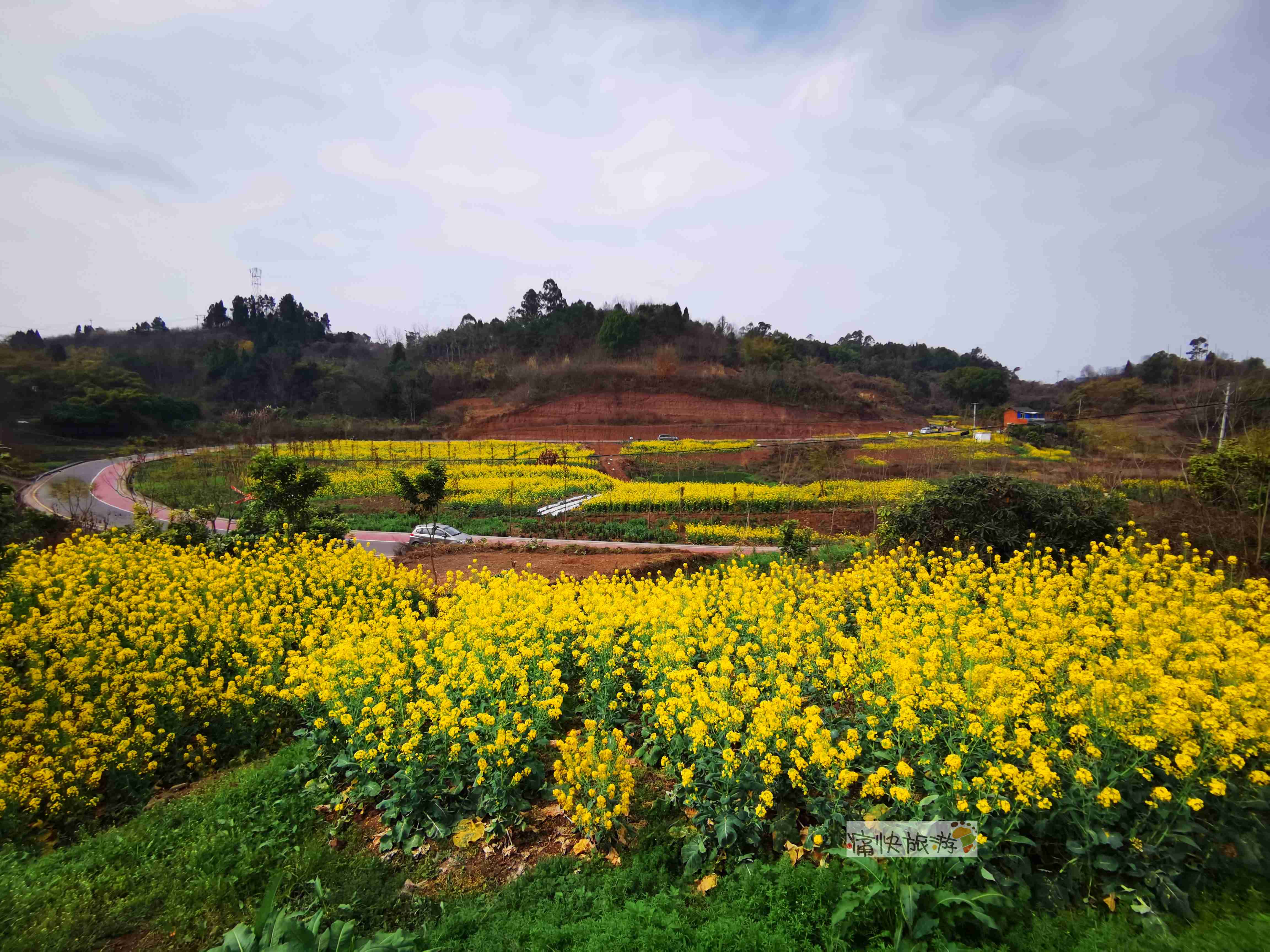 站在山坡俯瞰油菜花中的青龙湖马拉松赛道