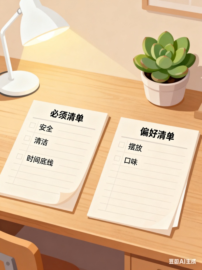 • 列出‘必须清单’(安全/清洁/时间底线)与‘偏好清单’(摆放、口味等)。• 确定冲突解决流程:记录→讨论→试运行→复盘。