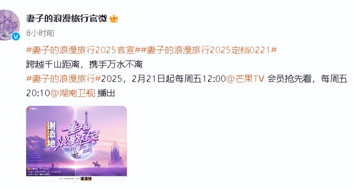 《再见爱人》结束之后明星的夫妻生活引起了观众的关注,就在情人节的这一天又一火爆夫妻综艺在今日官宣了,它就是《妻子的浪漫旅行2025》。