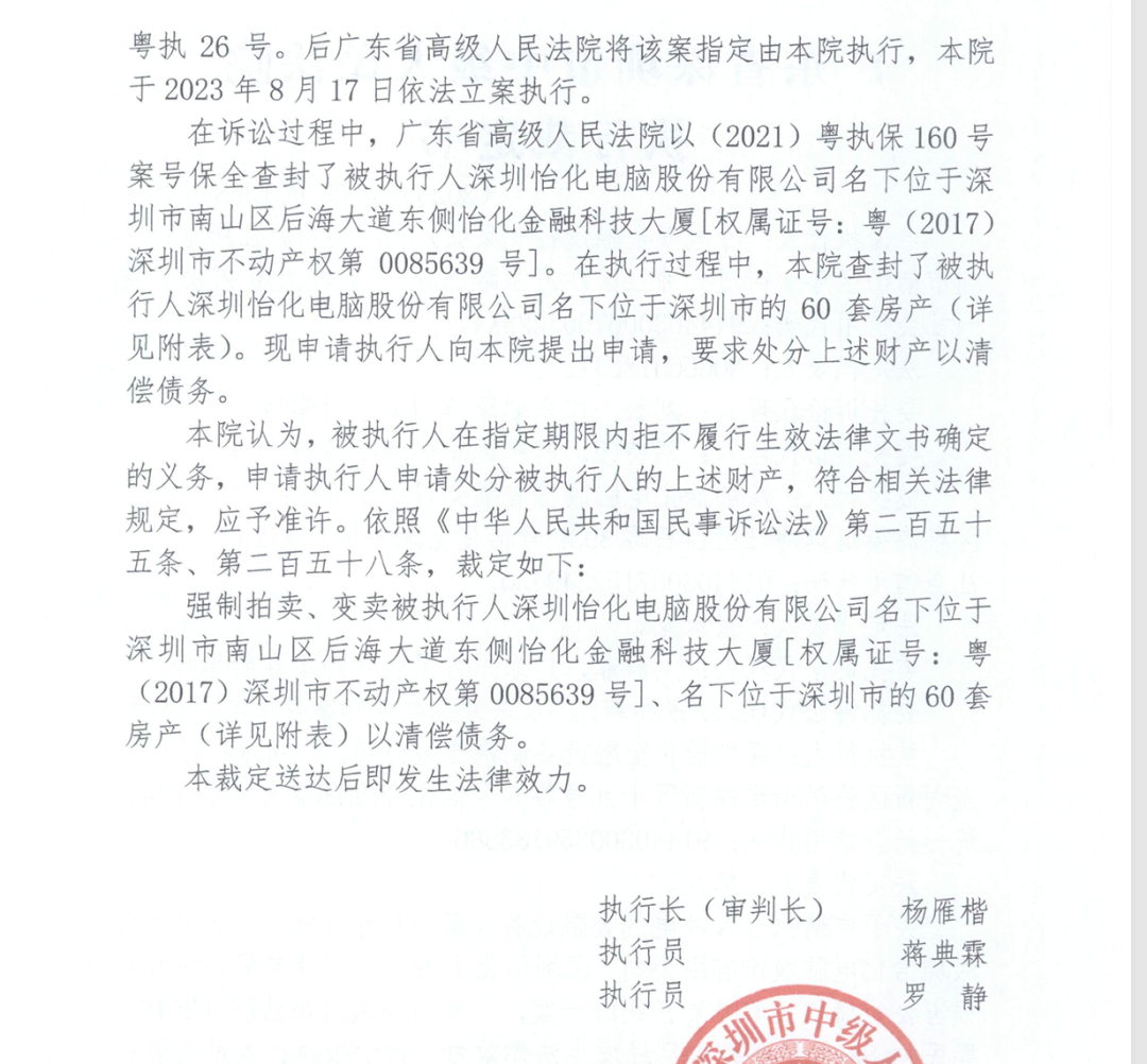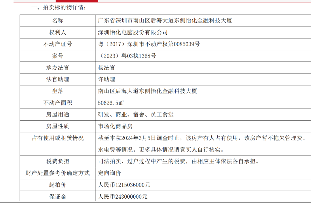 2025年2月25日深圳市中级人民法院通过文书(2023)粤03执1368号挂网京东拍卖平台第二次拍卖深圳怡化电脑股份有限公司名下位于广东省深圳市南山区后海大道东侧怡化金融科技大厦,粤(2017)深圳市不动产权第0085639号,房产面积50626.5㎡,972028800元起拍。最后因为无人报名竞买而流拍。