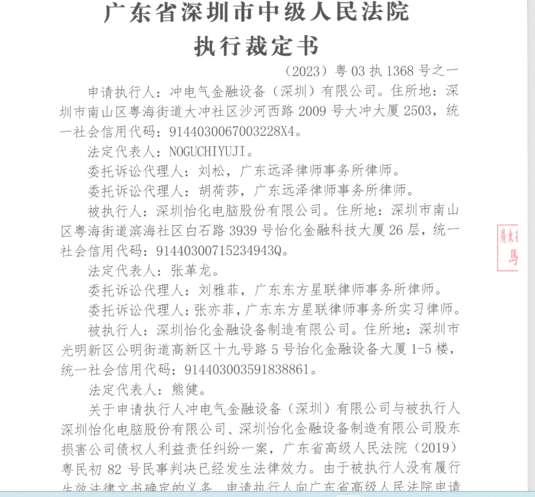 2.怡化电脑公司名下有独立的财产,深圳中院已经恢复对怡化电脑公司执行,一审判决第22页依据“冲电气公司合法债权长期未能受偿”认定冲电气公司的利益已经受到严重损害,与客观事实不符。