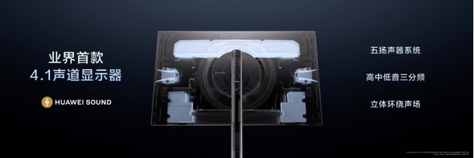 显示器的音频体验也一直是行业痛点:要么配备双声道小功率扬声器,音效平淡无力,要么完全依赖外接音箱。华为MateView GT显示器在这一维度实现了明显突破,支持华为悦彰(HUAWEI SOUND)音效,也是业界首款4.1声道三分频显示器。