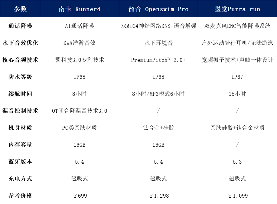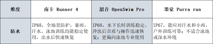 三款耳机在防水表现上的差异非常鲜明。南卡 Runner 4 以 IP68 的全场景防护实现了从暴雨到泳池的无缝覆盖,真正做到“全能型”。韶音 OpenSwim Pro 则在水下场景中展现出专业水准,是短时泳池训练的最佳选择。墨觉 Purra run 更像是一位户外伙伴,能够轻松应对汗水和雨水,但并未针对深水环境进行优化。整体来看,Runner 4 适合追求全场景覆盖的用户,OpenSwim Pro 适合泳者,而 Purra run 则是户外骑行和越野爱好者的可靠之选。