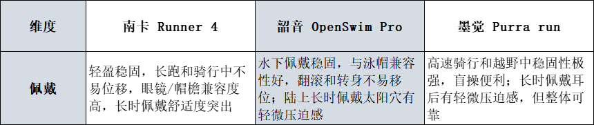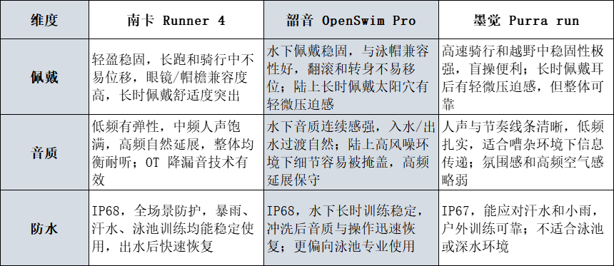 三款耳机在佩戴体验上的差异非常鲜明。南卡 Runner 4 在长跑、骑行和泳池训练中都能保持轻盈与稳固的平衡,长时佩戴舒适度表现突出,适合多场景使用。韶音 OpenSwim Pro 在水下的佩戴稳固性几乎无可挑剔,是泳池训练的理想选择,但在陆上长时运动中略显不足。墨觉 Purra run 则在高速骑行和越野场景中展现出极强的稳固性和可靠性,虽然舒适度稍逊,但在户外环境下的表现令人安心。整体来看,Runner 4 更适合追求全场景一致性的用户,OpenSwim Pro 适合以游泳为核心的运动者,而 Purra run 则是户外骑行和越野爱好者的可靠伙伴。