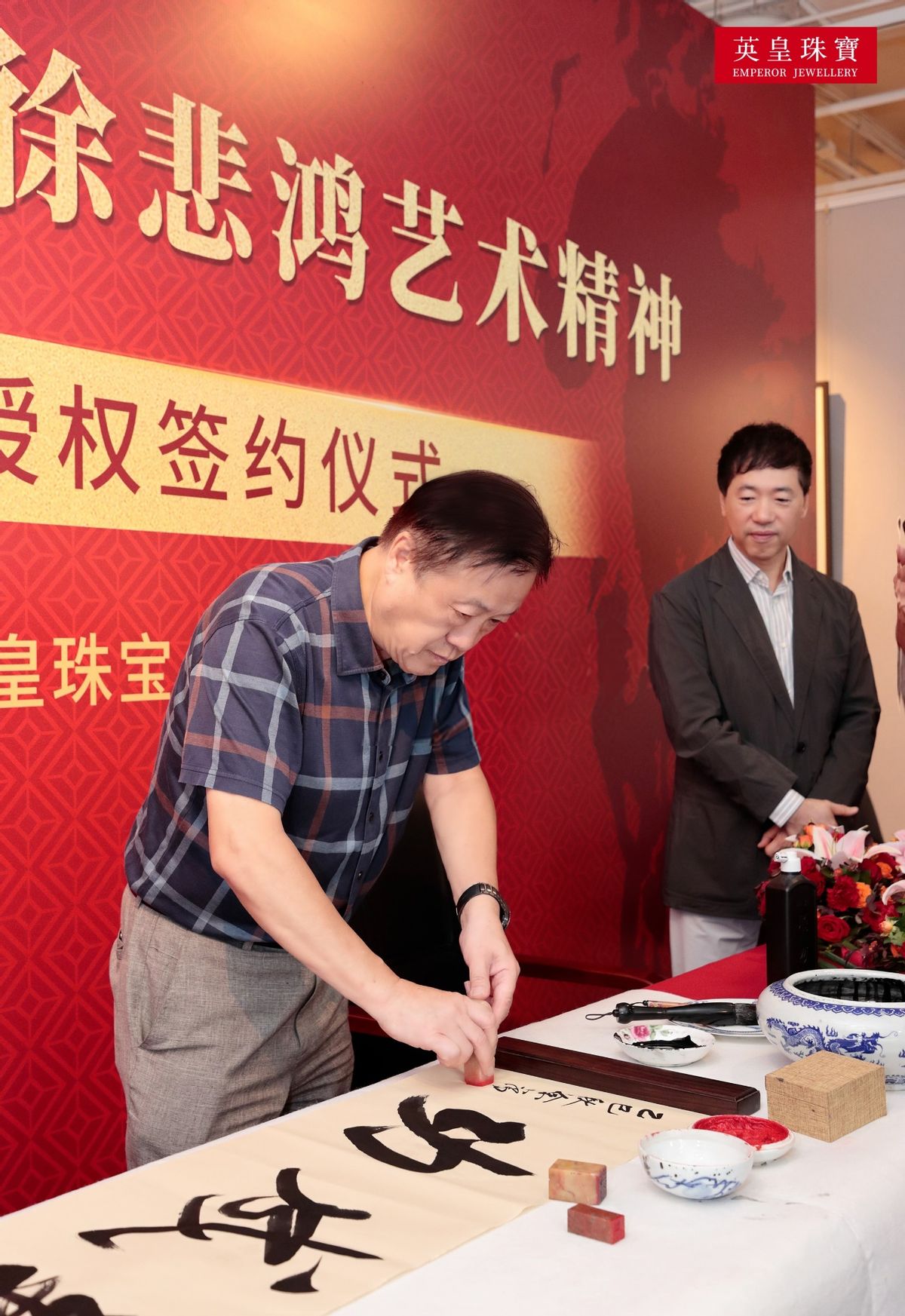 艺术馆内名流汇聚,在众人见证下,徐悲鸿艺术馆、英皇珠宝、深圳永宝诚,三方正式签署联合独家授权协议书。签约环节后,徐小阳先生现场挥毫泼墨,题写《马到成功》四字,随后郑重加盖徐悲鸿“东海王孙印”“徐小阳印”“一脉相承印” 三枚印章,将这幅墨宝赠予英皇珠宝代表陈世昌先生。这一环节不仅寓意合作顺遂,更彰显出艺术传承与创新发展的深远意义,成为仪式现场一大亮点。