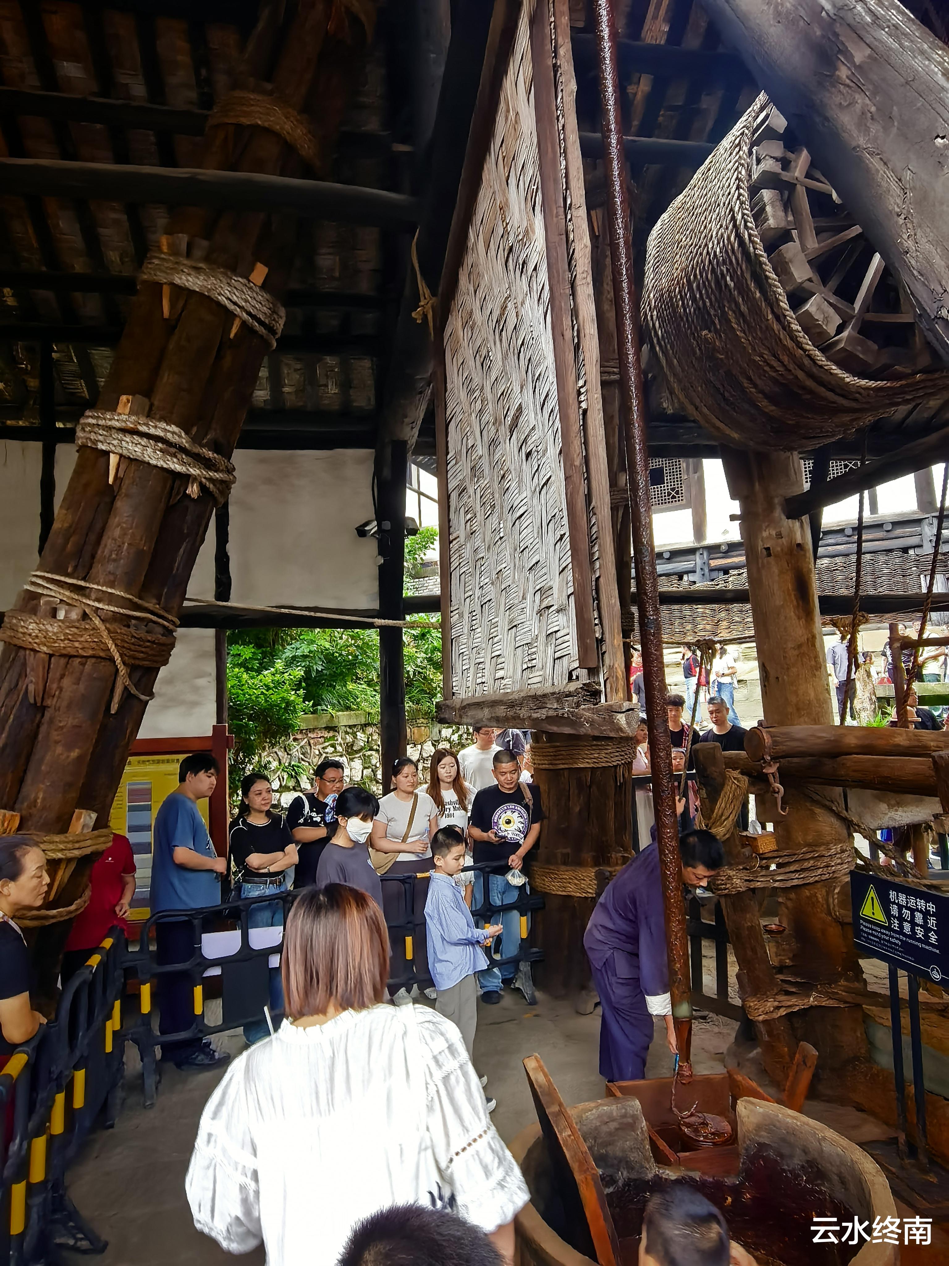 井房有木质井架下的卤水提取表演,通过竹筒从千米深井提取卤水,展现古代井盐生产流程。