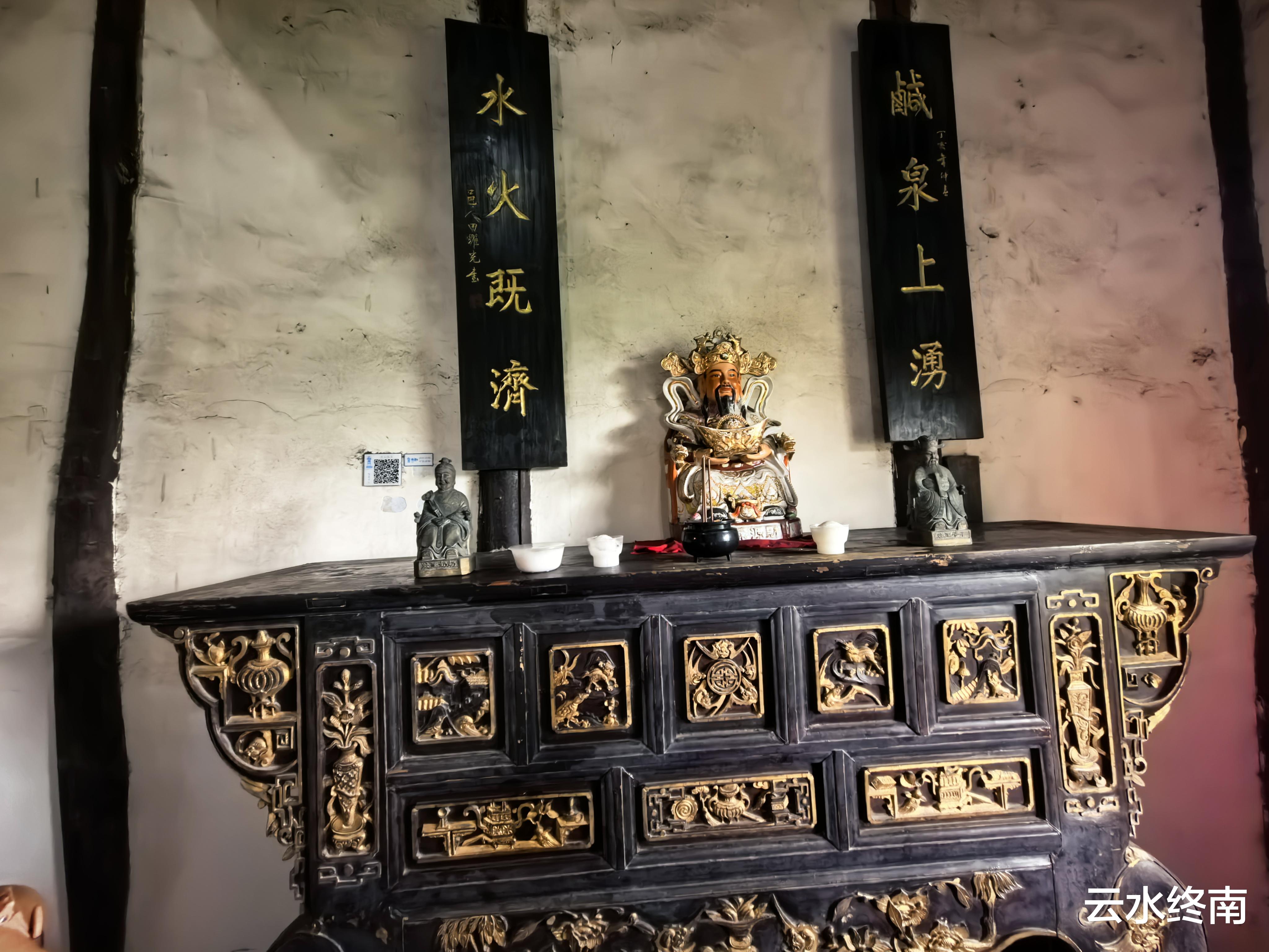 旁边还有柜房和盐仓,展示了当时盐场的交易情况。“卤泉上涌,水火既济”,不知道这个供奉是财神爷还是盐王爷。