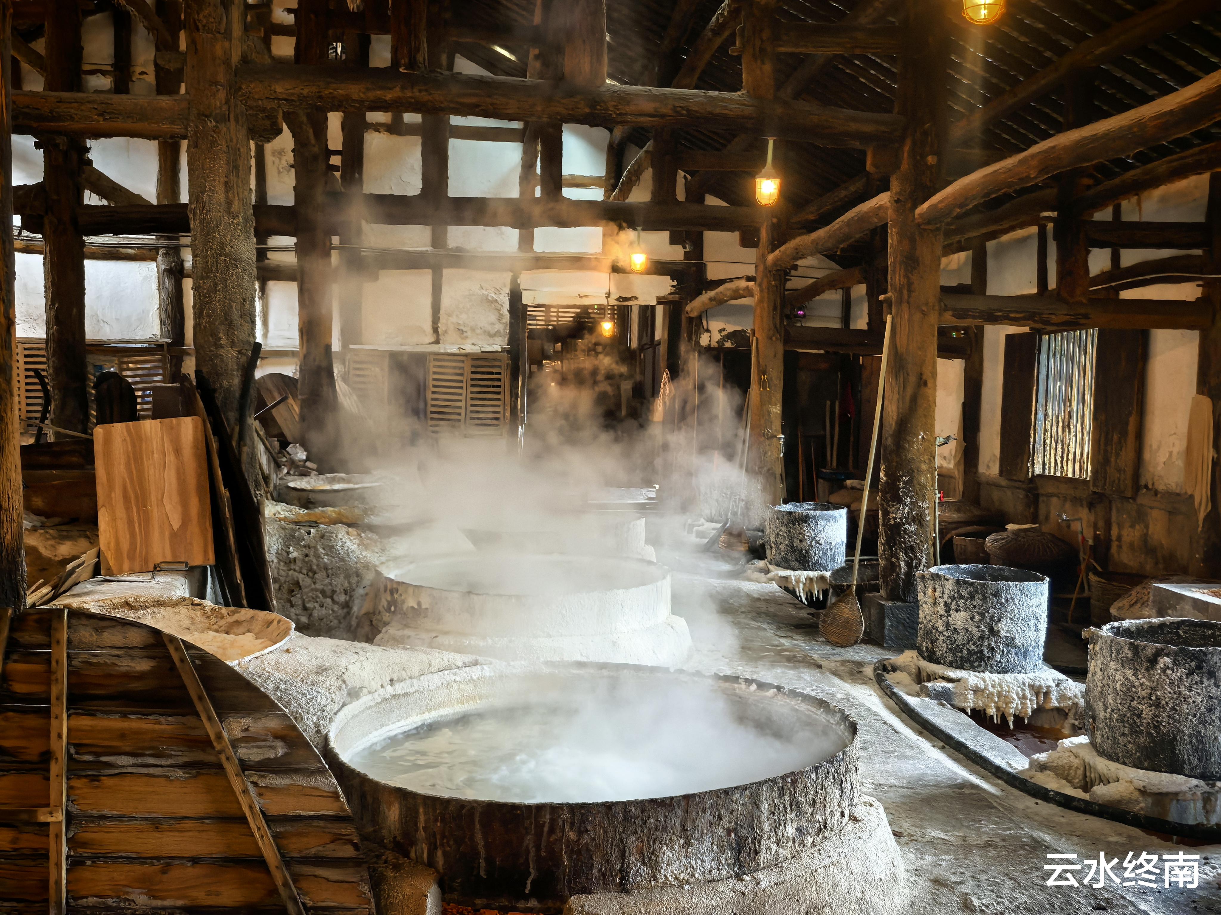 燊海井既产卤,又产气。现在工人用井里产的低压天然气熬盐,好几口圆锅煎盐,还有工人在劳作。