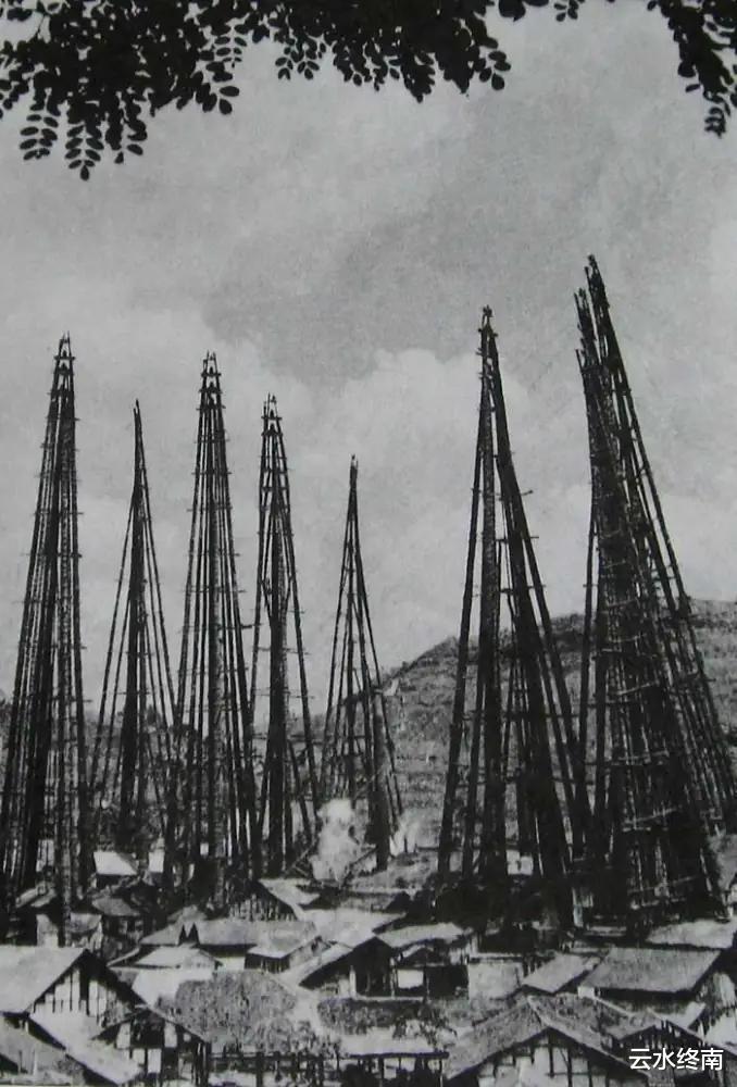 这个A字形木制井架也叫做天车“”,由杉木与竹篾绳捆扎而成,最高达113米,是中国现存最高的木制建筑,