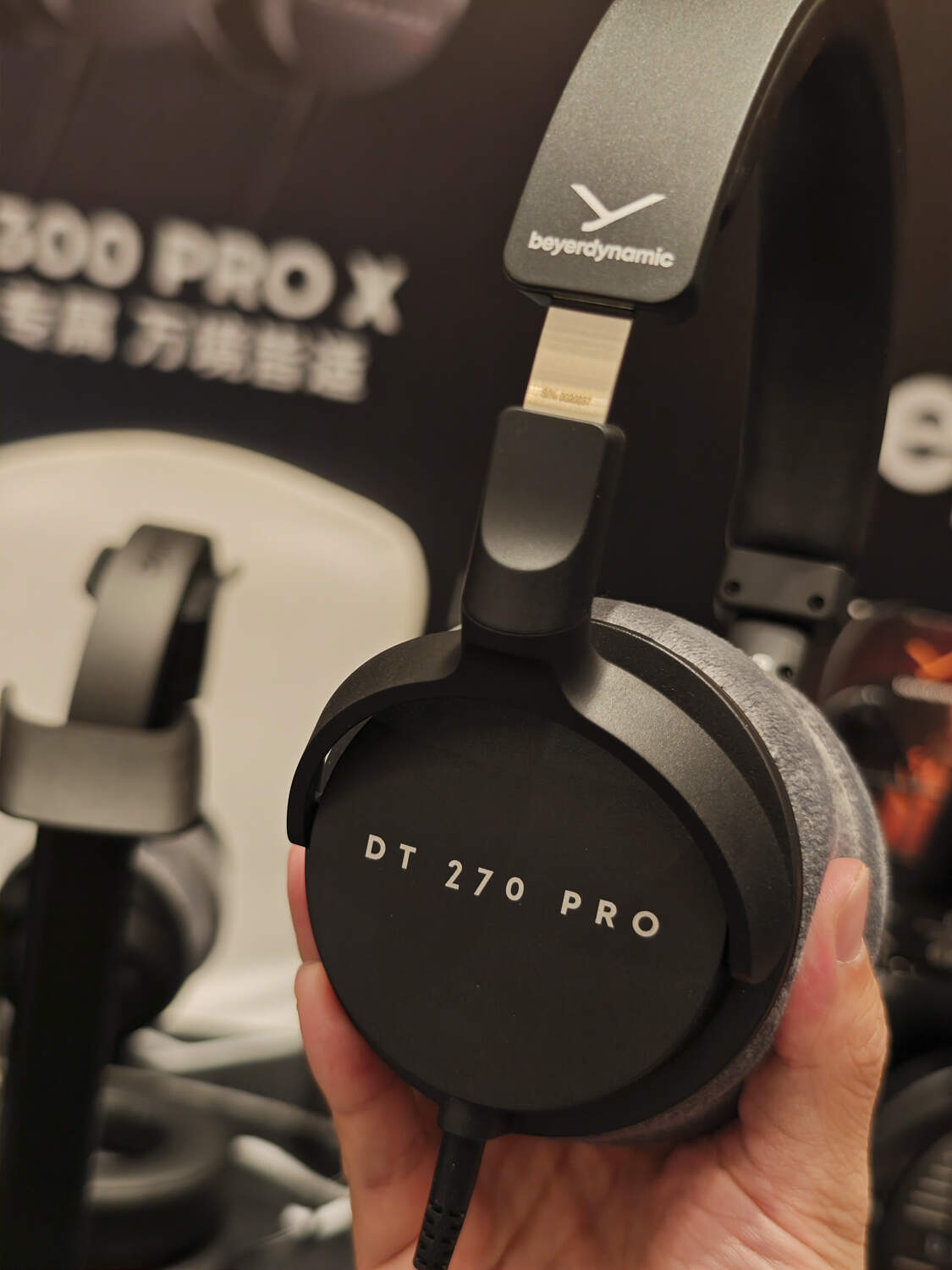 拜雅刚刚发布的新品头戴耳机DT270PRO和DJ300 PRO X这次都来到了展会现场。DT270PRO是介于专业监听和音乐欣赏之间的调音风格,低频的量感比拜雅之前的头戴监听系列在比例上要明显增大一些。整体的风格仍然时均衡直白的基调,音色中正还原为主。体型比起770和990系列要小上一圈,耳罩柔软,佩戴舒适,总体是那种轻便的、可以轻松带出门的头戴式耳机。DT270PRO相对容易驱动,甚至标配了一个小尾巴,可以直接搭配手机使用也能推得七七八八,在播放器上则有更加厚实和稳定的声音表现。