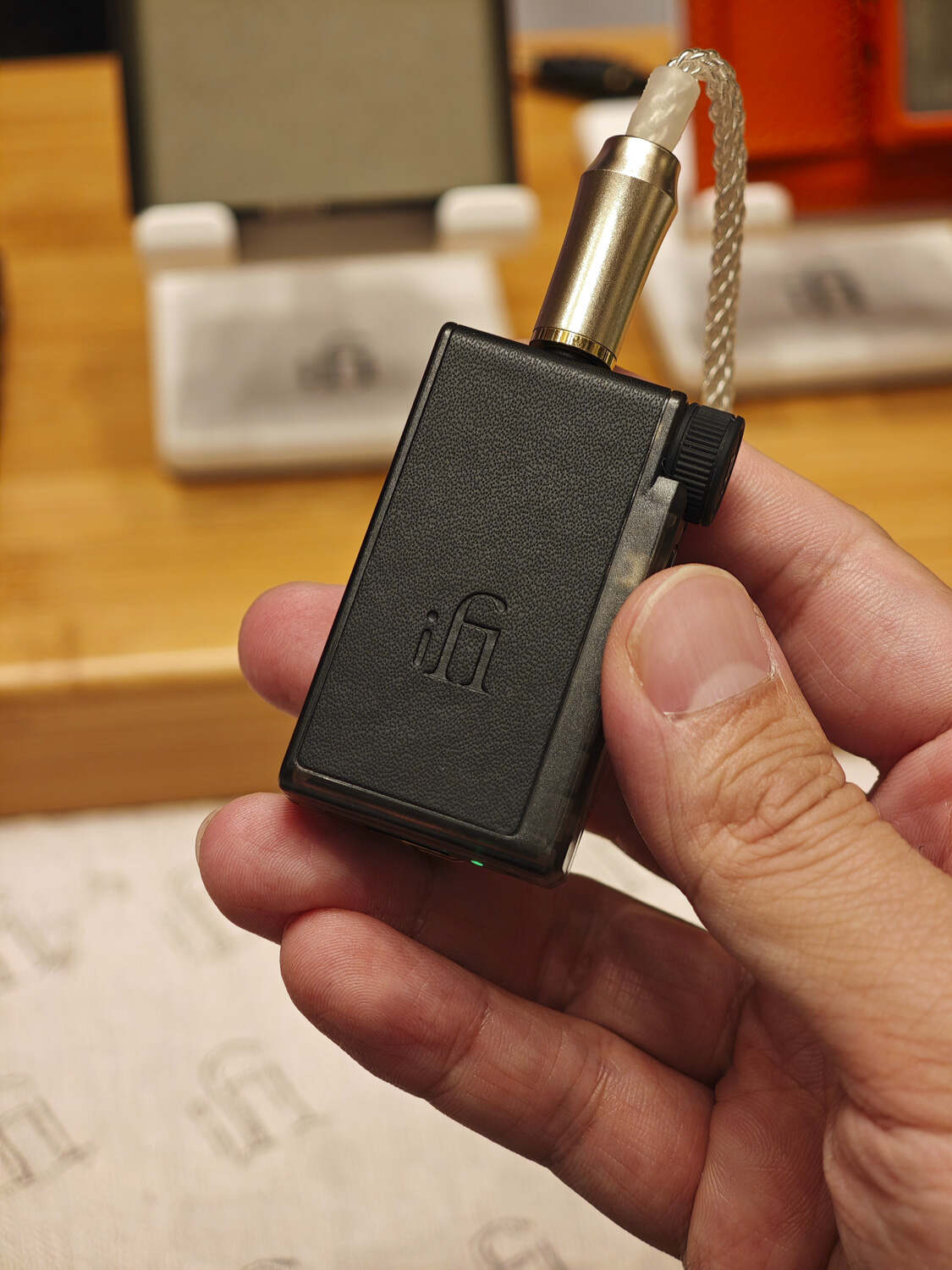 iFi的Go Blu Air,定价1000出头,声音表现我觉得已经超越了原来的Go Blu,机身为半透明材质,外观仍然是非常小巧和漂亮的设计语言。驱动力比想象的要大不少,用现场的MEZE99C和ENZO测试,都能推出相当完整和饱满的声音效果。背面的背夹是磁吸设计,可以拆卸。据说这个Air只是开胃菜(但我觉得已经很强了),后面还会有Go Blu的正统迭代版本出来。