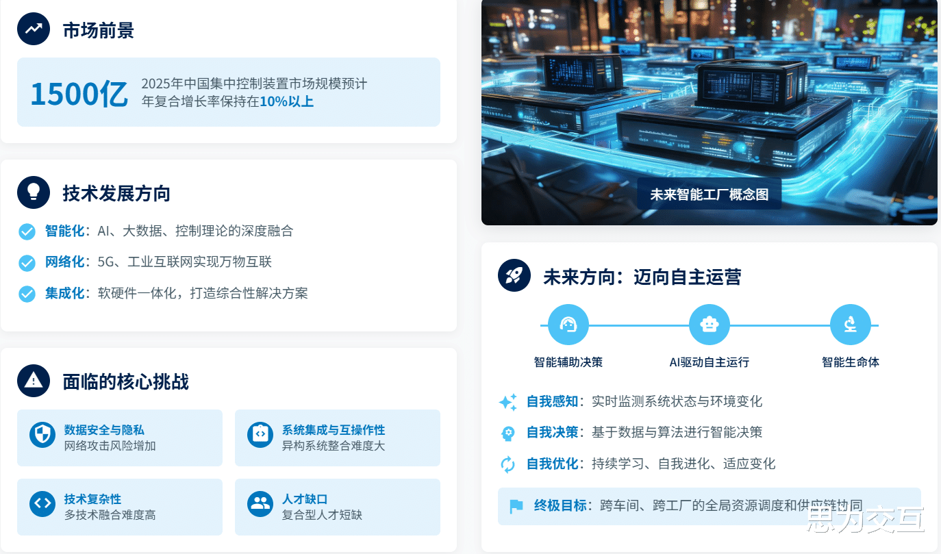 展望未来,集中控制系统将朝着更加自主化的方向演进。其终极目标,是实现从“智能辅助决策”到“AI驱动自主运行”的飞跃 。在这个阶段,系统不仅能优化单个工序,更能实现跨车间、跨工厂的全局资源调度和供应链协同,成为一个真正能自我感知、自我决策、自我优化的“智能生命体”。