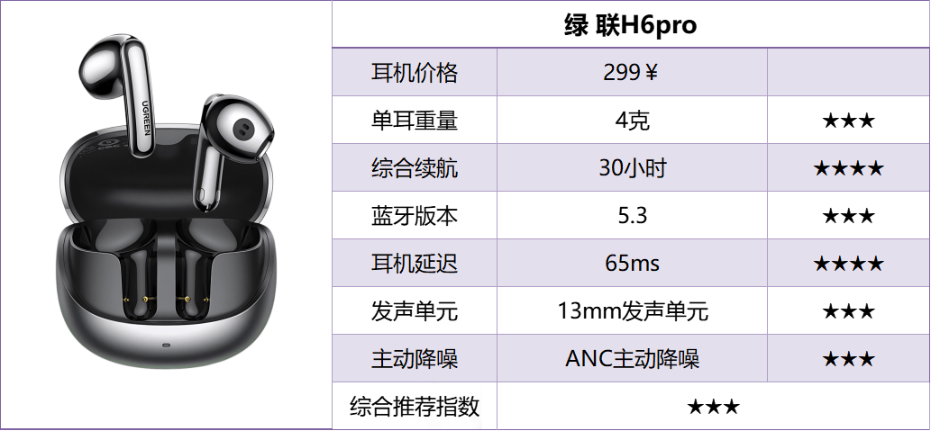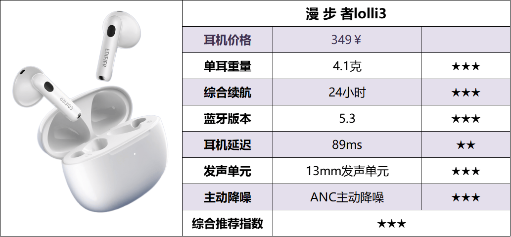 拥有长达 36 小时的综合续航(降噪关)和 7.5 小时的单次续航(降噪关),支持蓝牙 5.3 ,连接可靠稳定且低功耗,实际体验延迟在80ms左右,延迟中下水准。