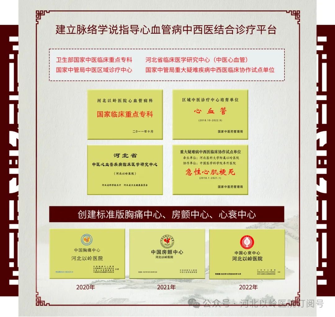 河北以岭医院心血管病科为国家卫健委中医临床重点专科,河北省中医心血管国家临床重点专科,国家区域诊疗中心,国家中医药管理局络病重点研究室及络病学重点学科建设单位,北京阜外医院心血管病诊疗基地,并成功创建国家标准版胸痛中心、房颤中心、心衰中心。