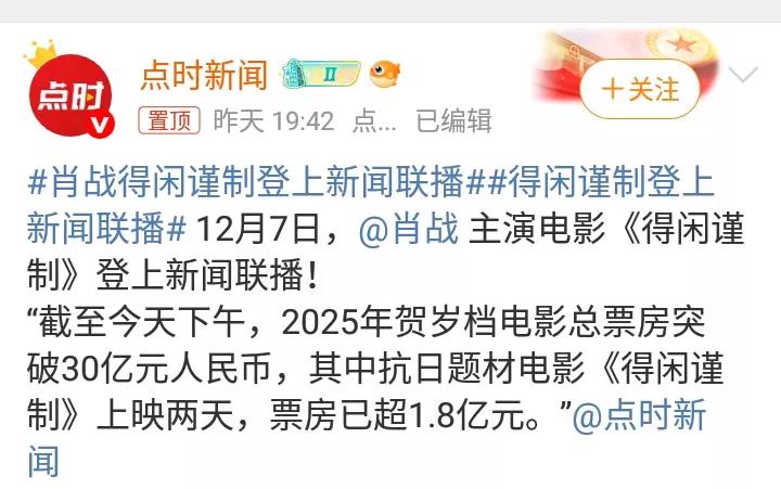 点时新闻在社交平台发文,传来电影《得闲谨制》上映两天后,关于票房的好消息!票房已经超过1.8亿,由此证明电影《得闲谨制》的票房良好开端。优秀电影就是这样感人至深!总是能够用自身的实力来证明自己!对于艺人肖战来说,电影《得闲谨制》的成功上映,就是影视演员实现电影梦想的见证!