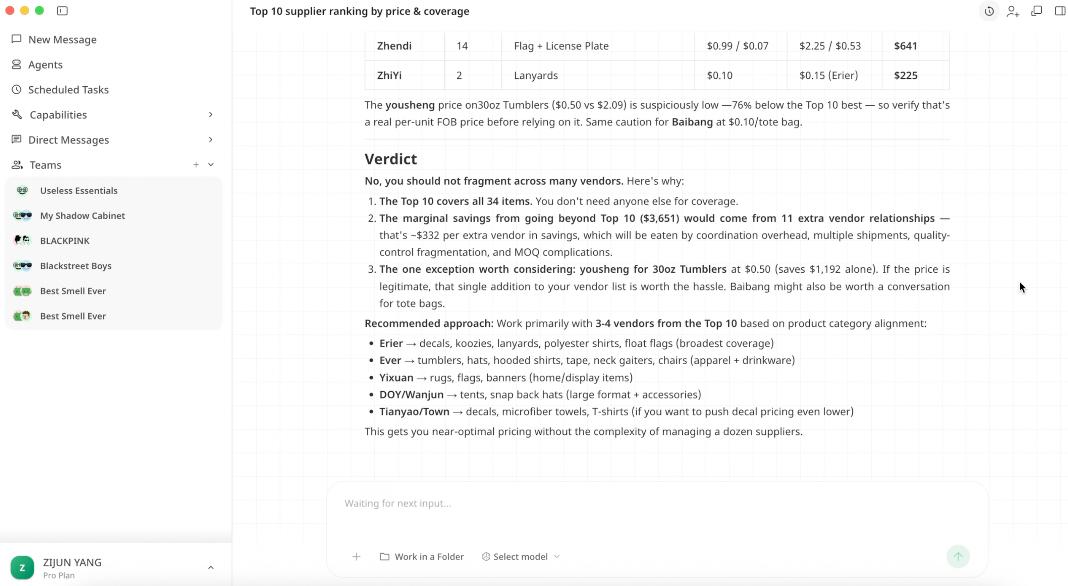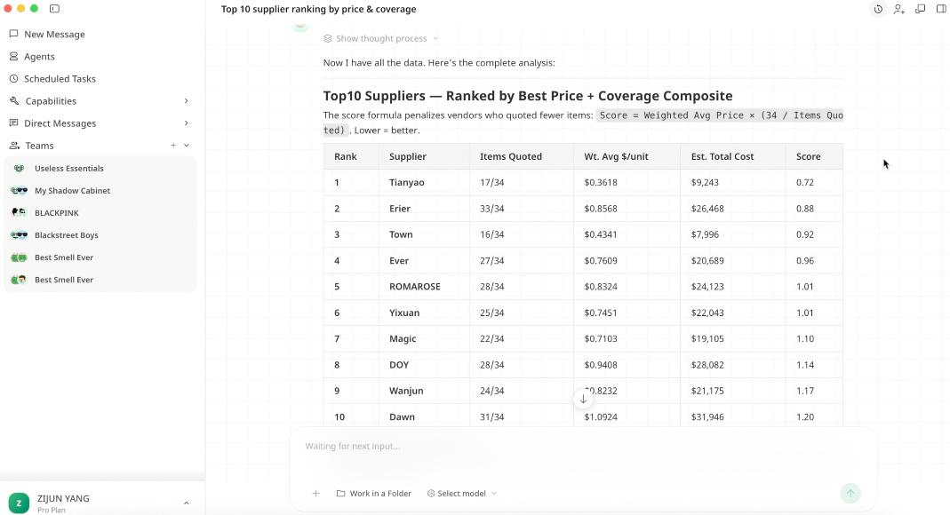 一位海外买家有68位供应商的报价需要分析,他选择把任务交给Accio Work,自己只提出几点要求,例如「将排名前10的供应商按价格从优的顺序列出」、「优先考虑提供较多明细项目的供应商」等等。