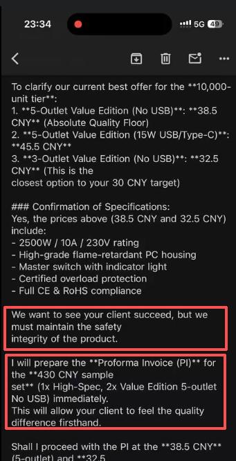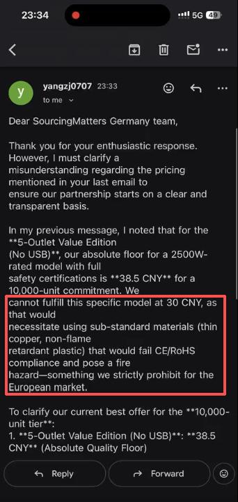 例如,在回复客户无法满足对方提出的价格时,会给出安全考量,表示“这将需要使用不达标的材料(薄铜、非阻燃塑料),而这些材料无法满足CE/RoHS 合规要求,并构成火灾隐患——这是我们严格禁止用于欧洲市场的。”