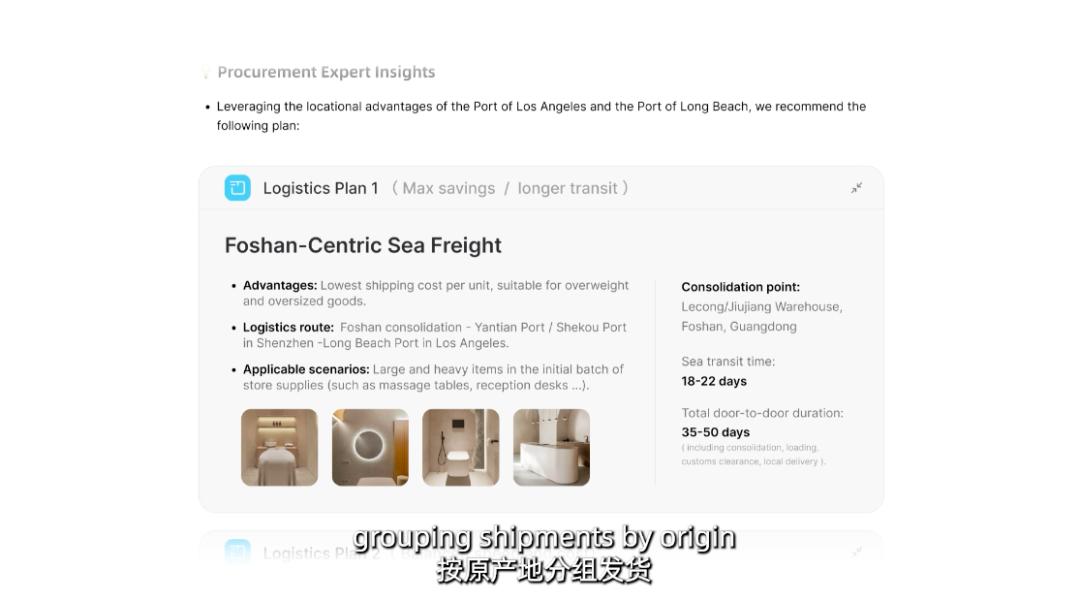 当海伦拿出方案后,Accio Work的「采购代理」会自动启动,在全球范围内搜索目标商品,比价、筛选、匹配预算;然后「谈判代理」上场,跟供应商博弈;交易落锤,货物到手,「物流代理」立刻上线,按原产地分组,比价、拼单、选最便宜的路线,把成本压到最低。