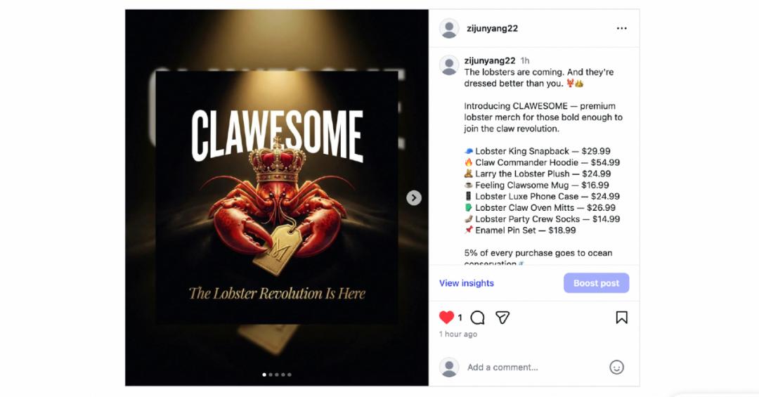 它还会依据店铺名(Clawesome)和口号(帮助一只龙虾征服世界),做好宣传海报和文案,整个版面不仅有视觉重点,还细心标注了产品类目和价格明细。