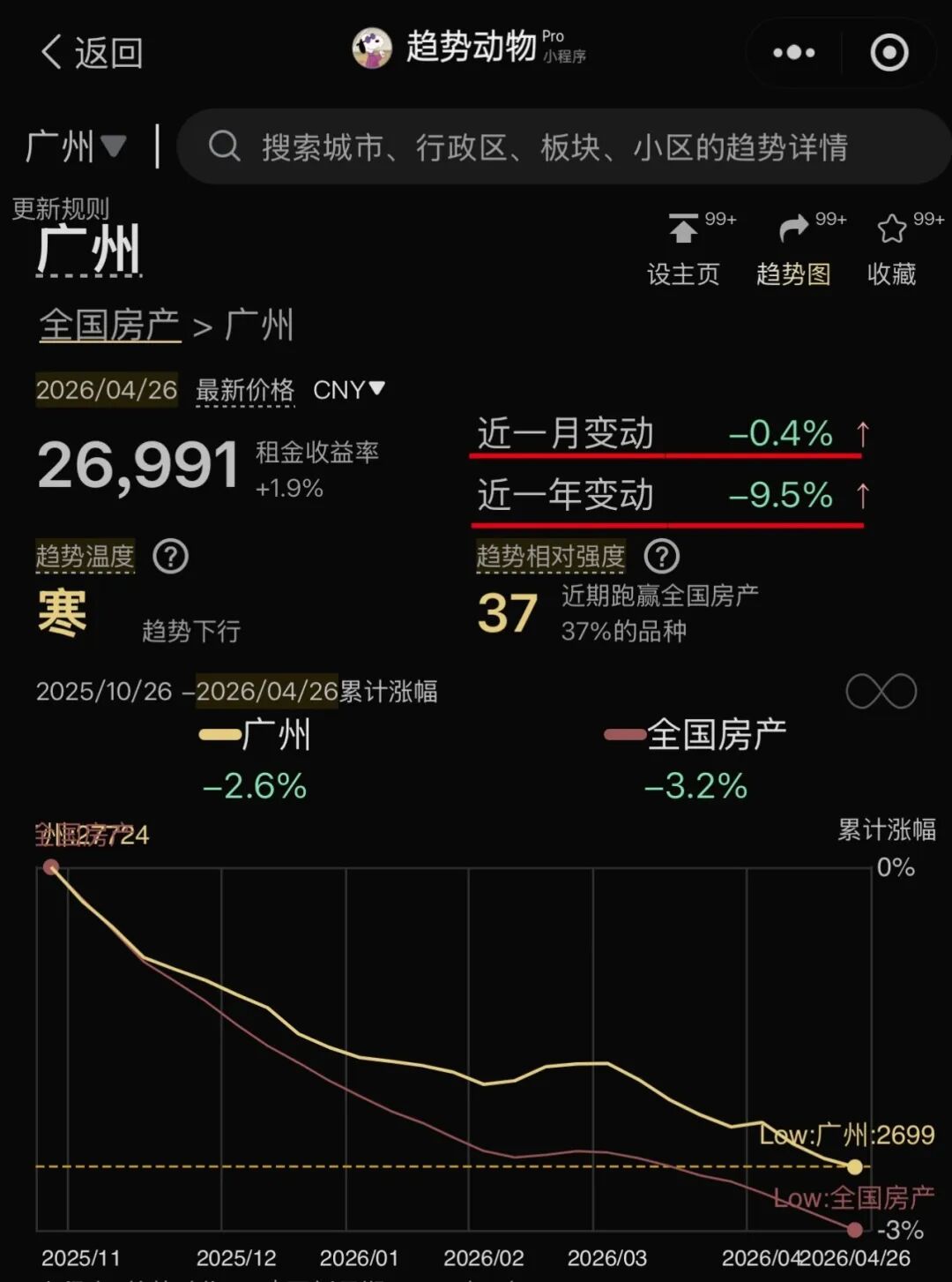 截至4月26日:26991元/㎡,同比上年9.5%,环比上月0.4%,环比上周27012元/㎡0.08%