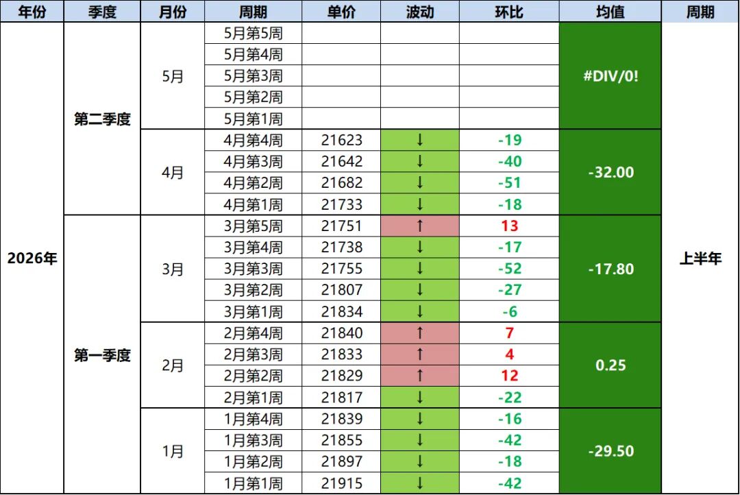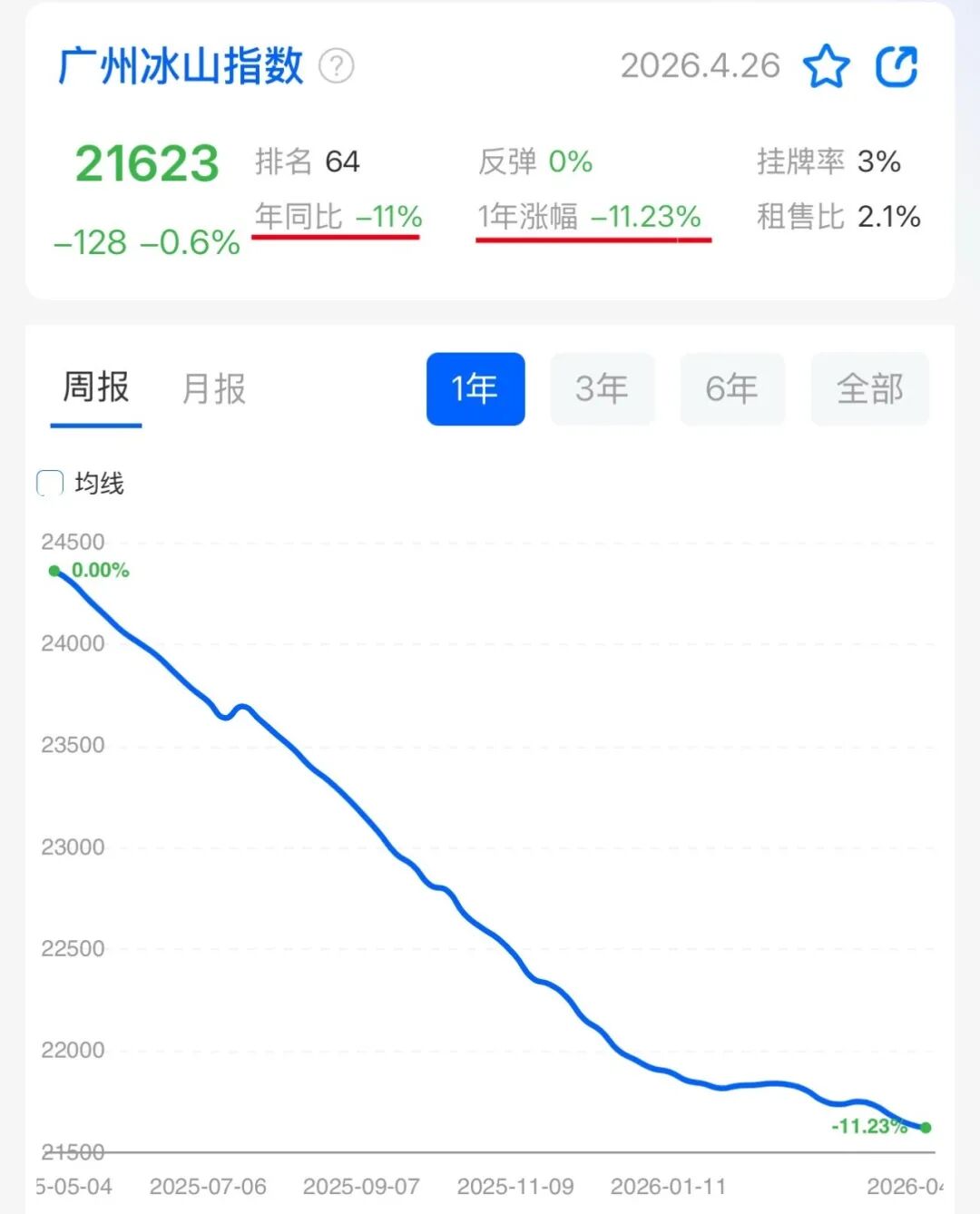 【冰山指数】1月4日为21915元/㎡ → 4月26日为21623元/㎡,累计下跌约1.33%,年化后约4-5%