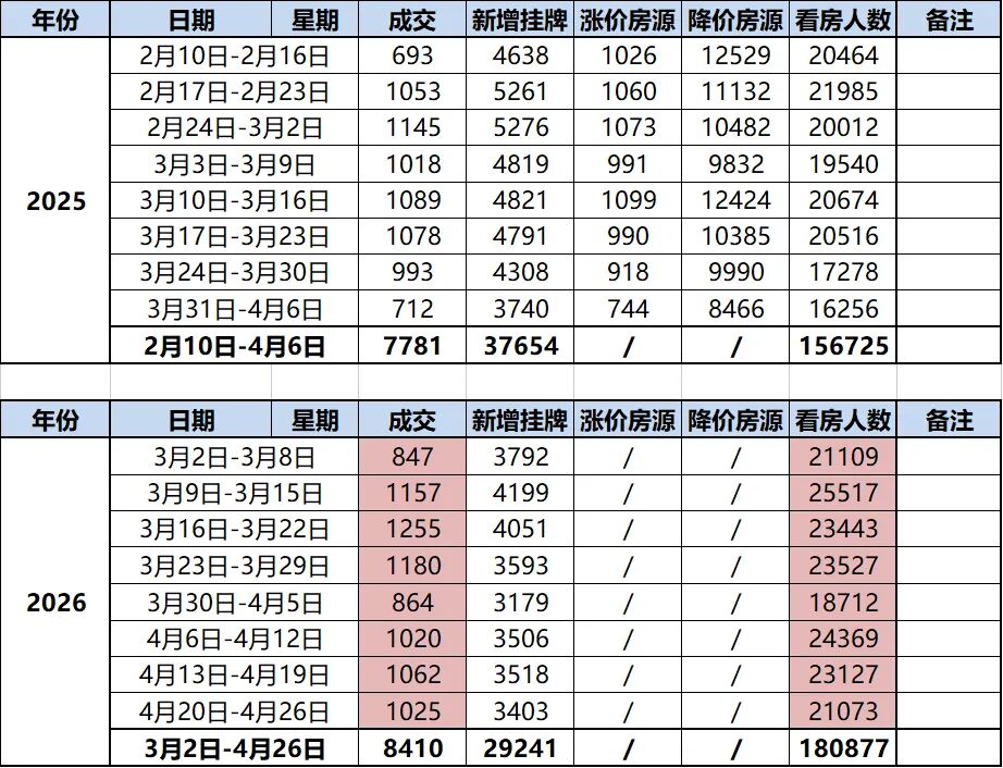2025年(2月10日-4月6日):累计7781套2026年(3月2日-4月26日):累计8410套