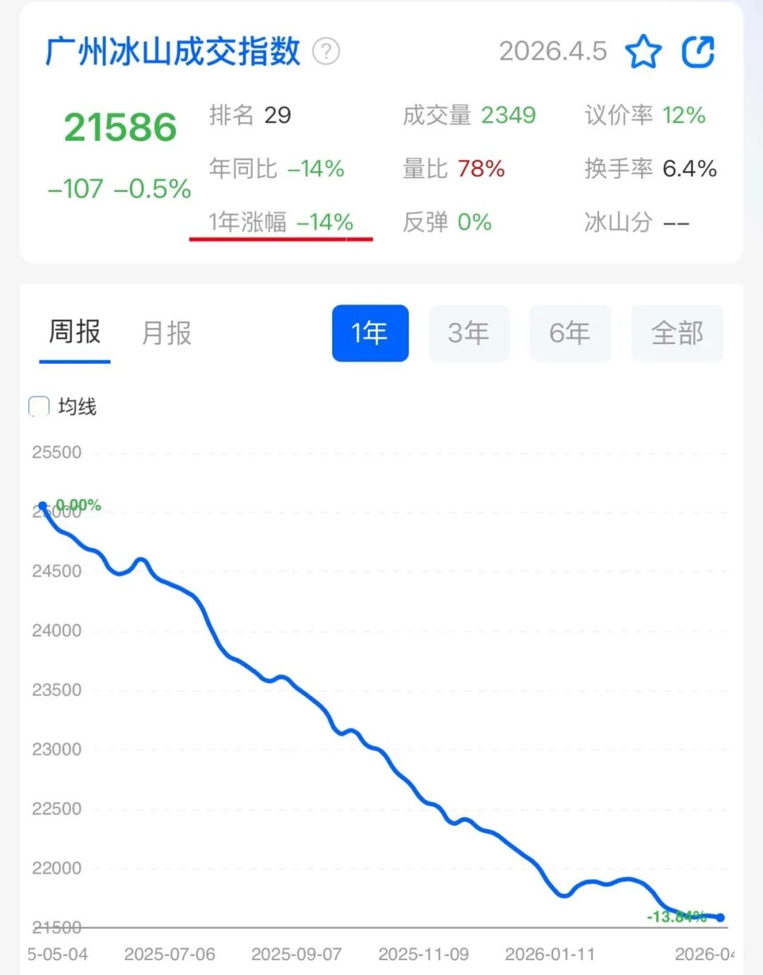 【冰山成交指数】1月4日为22026元/㎡ → 4月5日为21586元/㎡,累计下跌约2.0%,年化后约5-6%