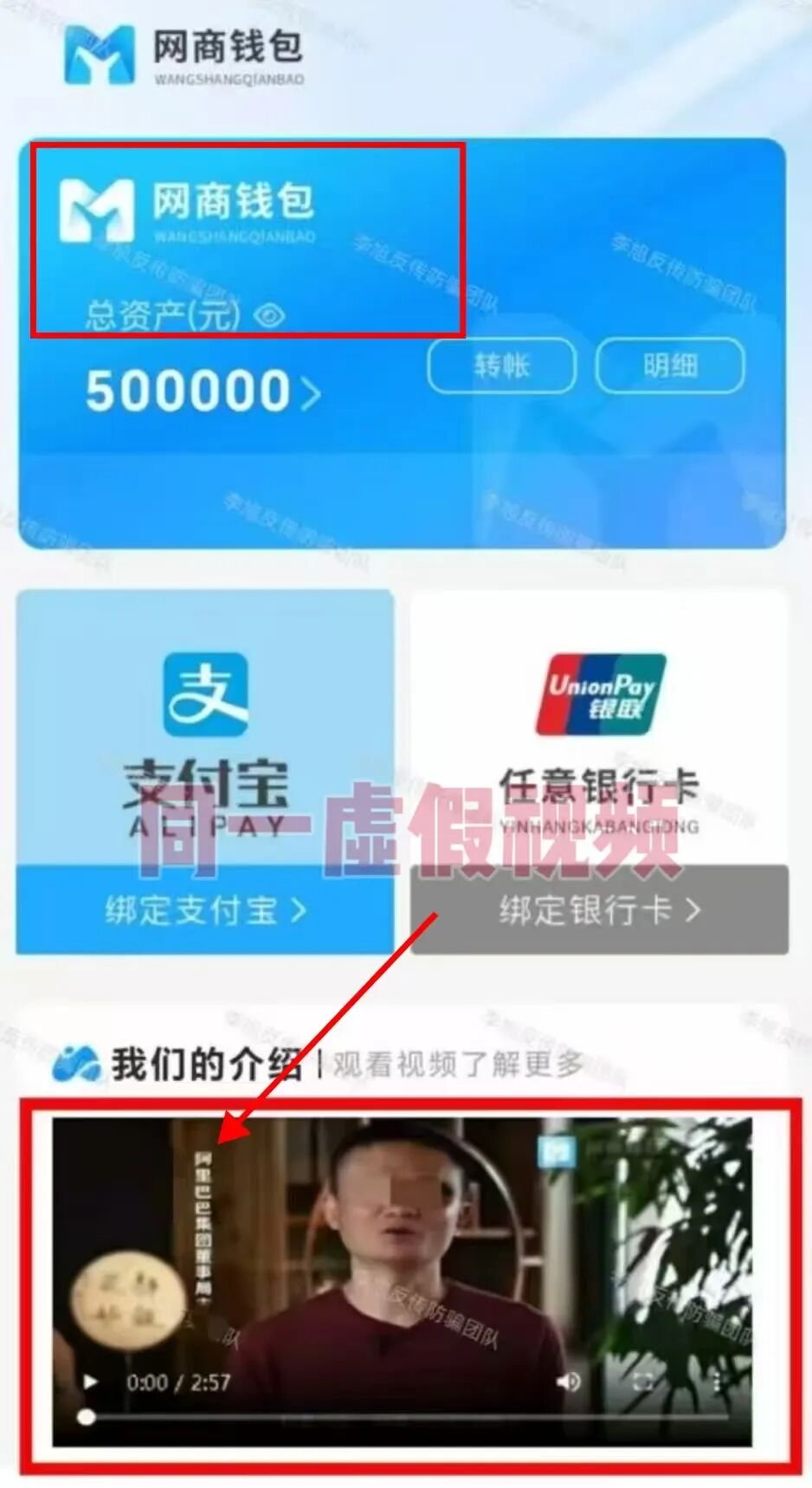 虚构的“网商钱包”APP:冒充阿里巴巴推出的“网商钱包”APP,利用AI数字人制作虚假视频,忽悠用户实名注册赠送现金额度及股权。