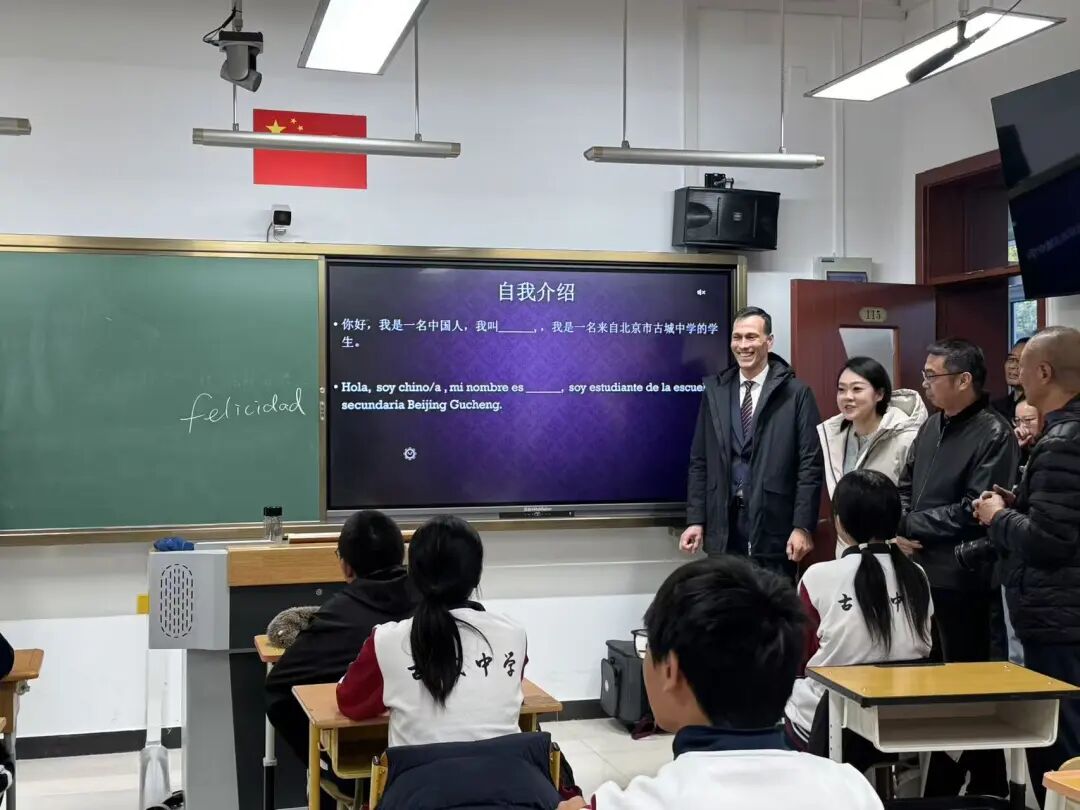 在校领导的带领下,来宾们漫步于古城校园,感受着浓厚的育人氛围和蓬勃的青春气息。丰富多彩的社团活动展示,让代表团成员们频频点头称赞。在西语社团,Juan Conzalez校长走近同学间,亲自教授了大家一个充满美好寓意的西班牙语单词——“felicidad”(幸福)。他耐心地发音、解释,将这份来自异国的真挚祝福,清晰地传递给每一位古城学子,这一刻,文化在互动中悄然交融,幸福的笑容在每个人的脸上绽放。