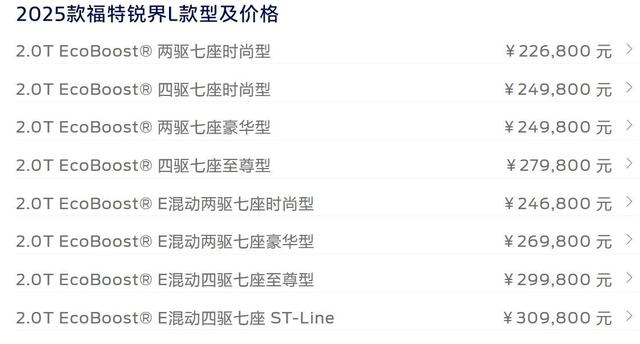 不过令人纠结的是,2025款锐界L拥有4个燃油款型和4个混动款型,每一款都有自己突出的优势。分析之前,先介绍一下2025款锐界L(以下简称“锐界L”)各款型的统一基本信息。这是长安福特旗下的一款中大型SUV,车身长度达到了5米,轴距接近3米,为2950mm,全系均为7座车型,在同级别车型中占据很大优势。