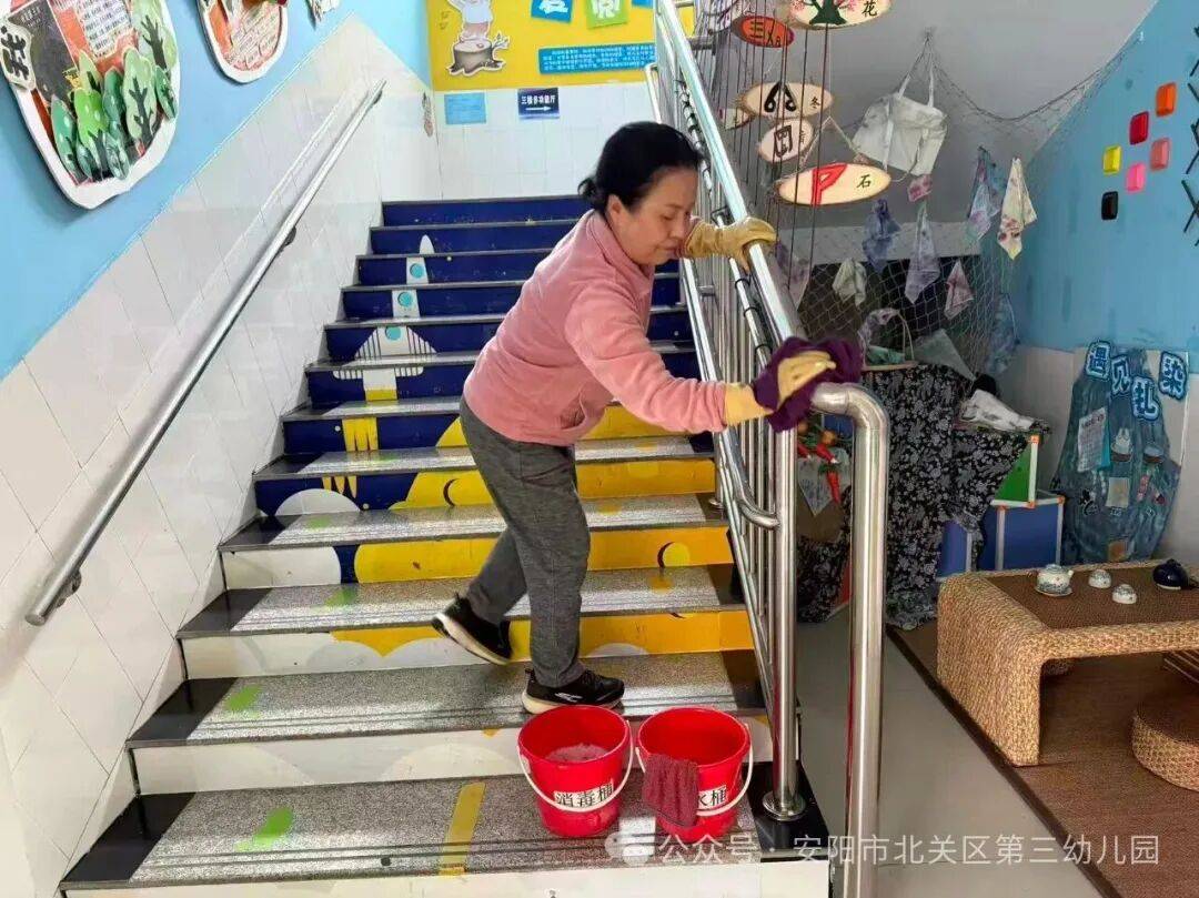 物表清洁:对门把手、桌椅、玩具柜、楼梯扶手、水龙头等孩子高频接触的点位,每日使用符合标准的消毒剂进行“擦拭--清水再擦”的清洁流程,不留死角。