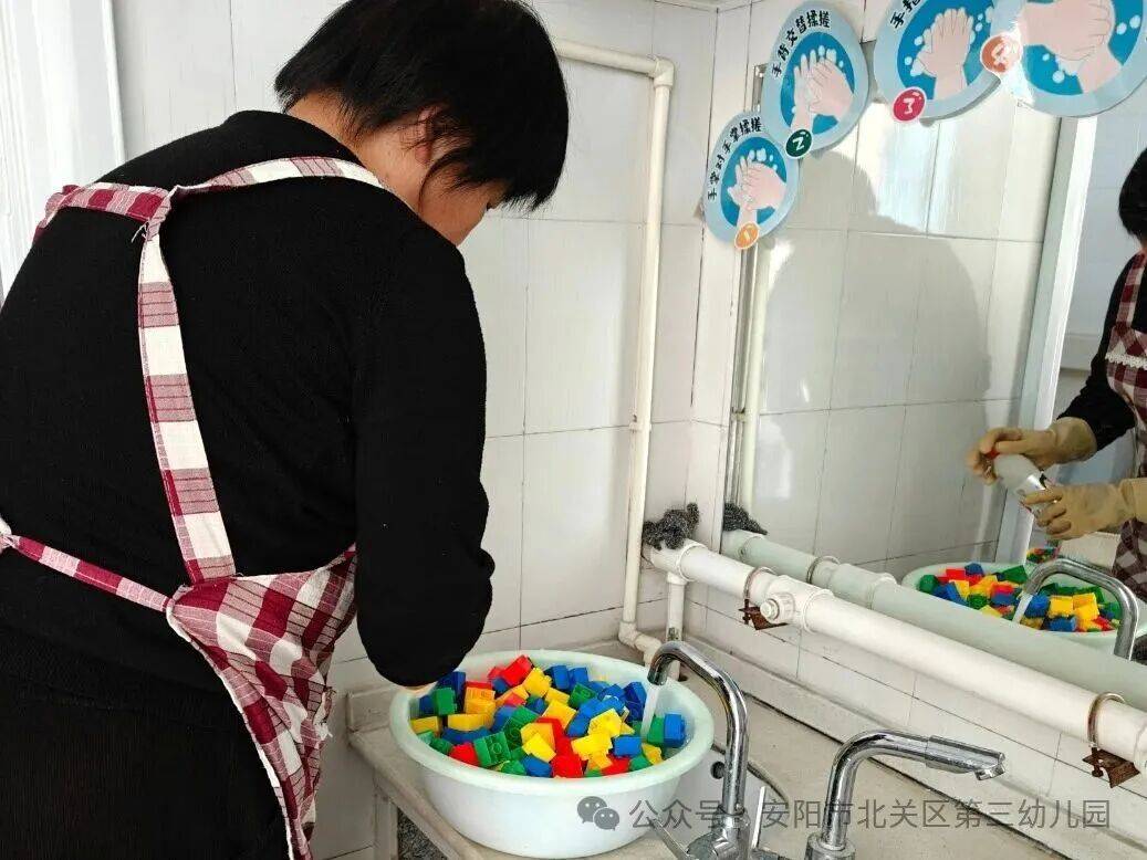 玩教具消毒:玩具每日浸泡或擦拭消毒,让阳光成为最好的“消毒剂”。