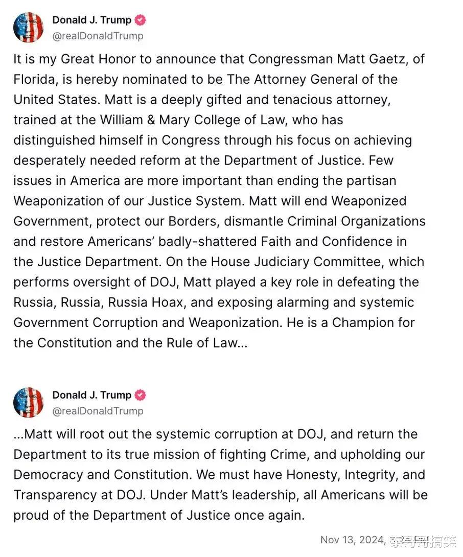 川普还说:“马特将结束武器化政府,保护我们的边境,瓦解犯罪组织,恢复美国人对司法部的信心。在负责监督司法部的众议院司法委员会中,马特在击败俄罗斯骗局以及揭露令人震惊的系统性政府腐败和武器化方面发挥了关键作用。他是宪法和法治的捍卫者。”
