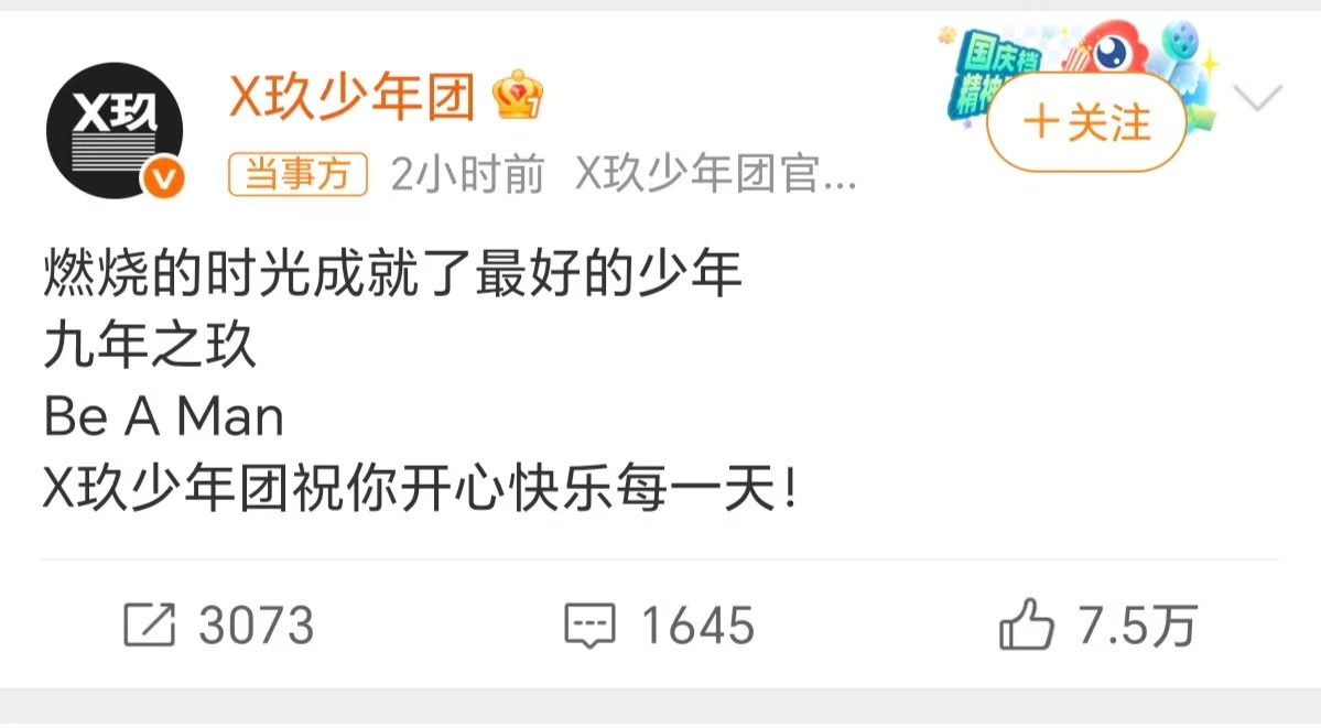 7月18日晚,X9少年团官方微博发文:“燃烧的时光,成就了最好的少年,9年之玖,X玖少年团,祝你开心快乐每一天!”正式宣告组合解散。