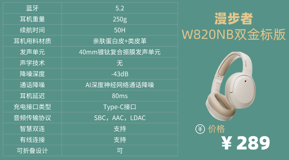 ●产品10、漫 步 者W820NB双金标版头戴式降噪耳机