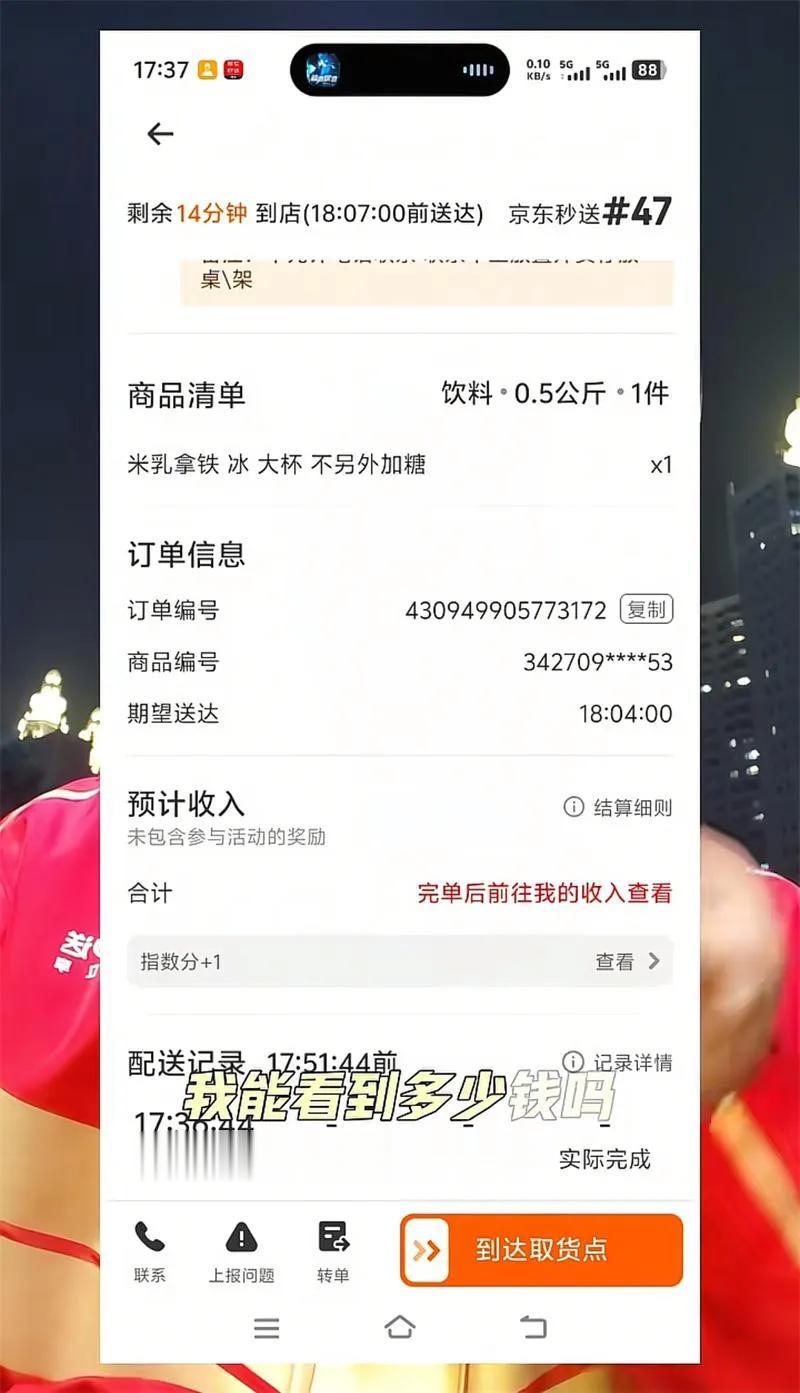京东骑手在短视频晒出订单截图显示,未开始配送前骑手看不到单价。