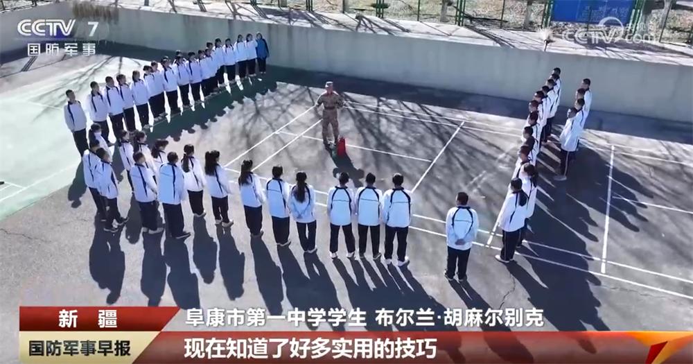 在新疆阜康,新疆军区某团官兵走进驻地中学,开展消防救援演练。同学们在老师和官兵的引导下,沿着预定的逃生路线有序撤离教学楼。