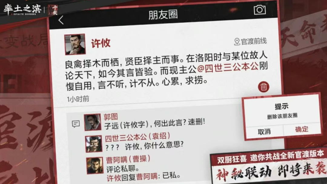 例如《率土之滨》之前公布的悬念海报之一就是,许攸抱怨老板“@四世三公本公”刚愎自用,然后发了句“心累,求捞”在线求职。评论区同事郭图急着劝删,老板袁绍满头问号,而竞争对手曹操则冷静地敲下“评论私聊”,最终许攸回复“已私”。