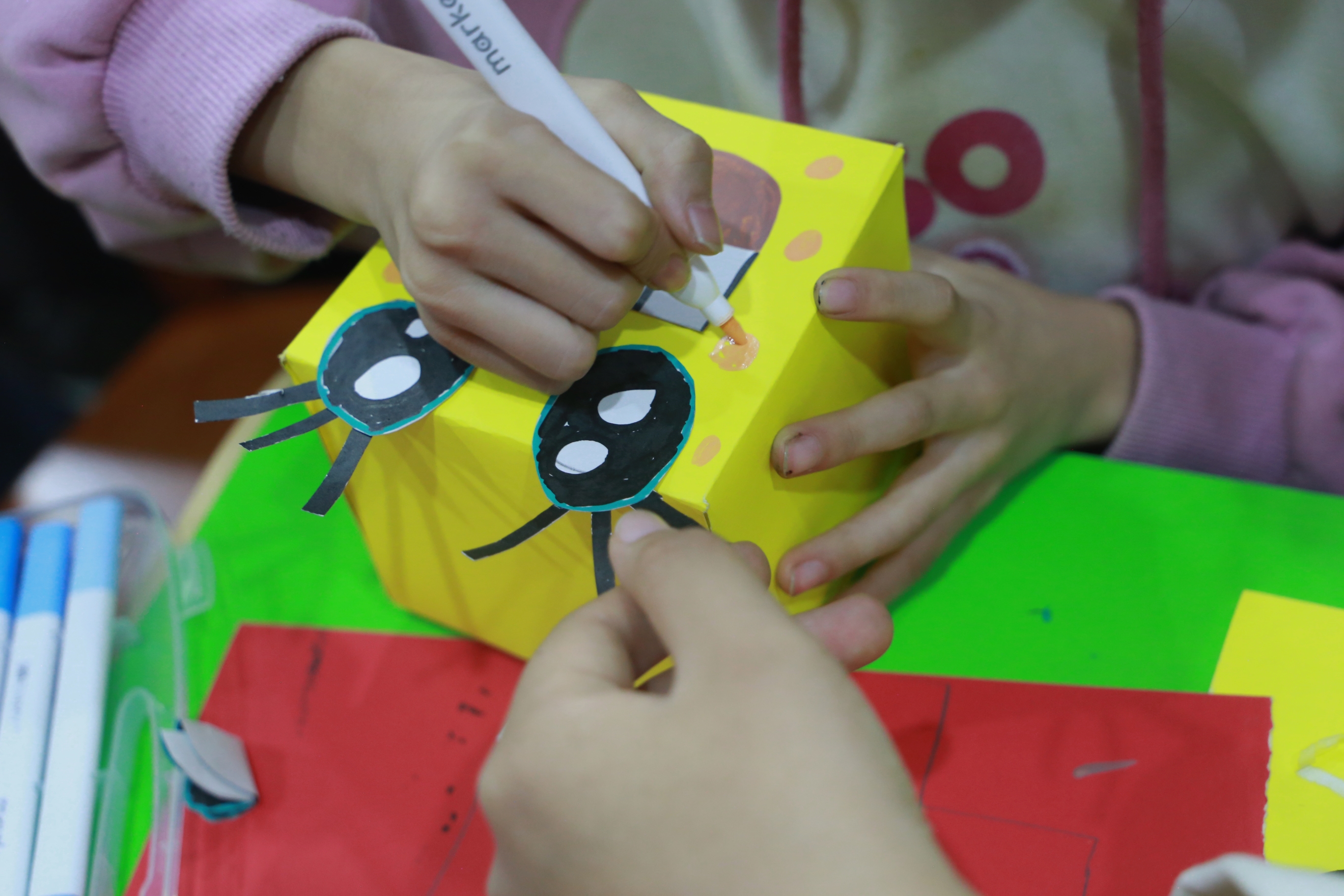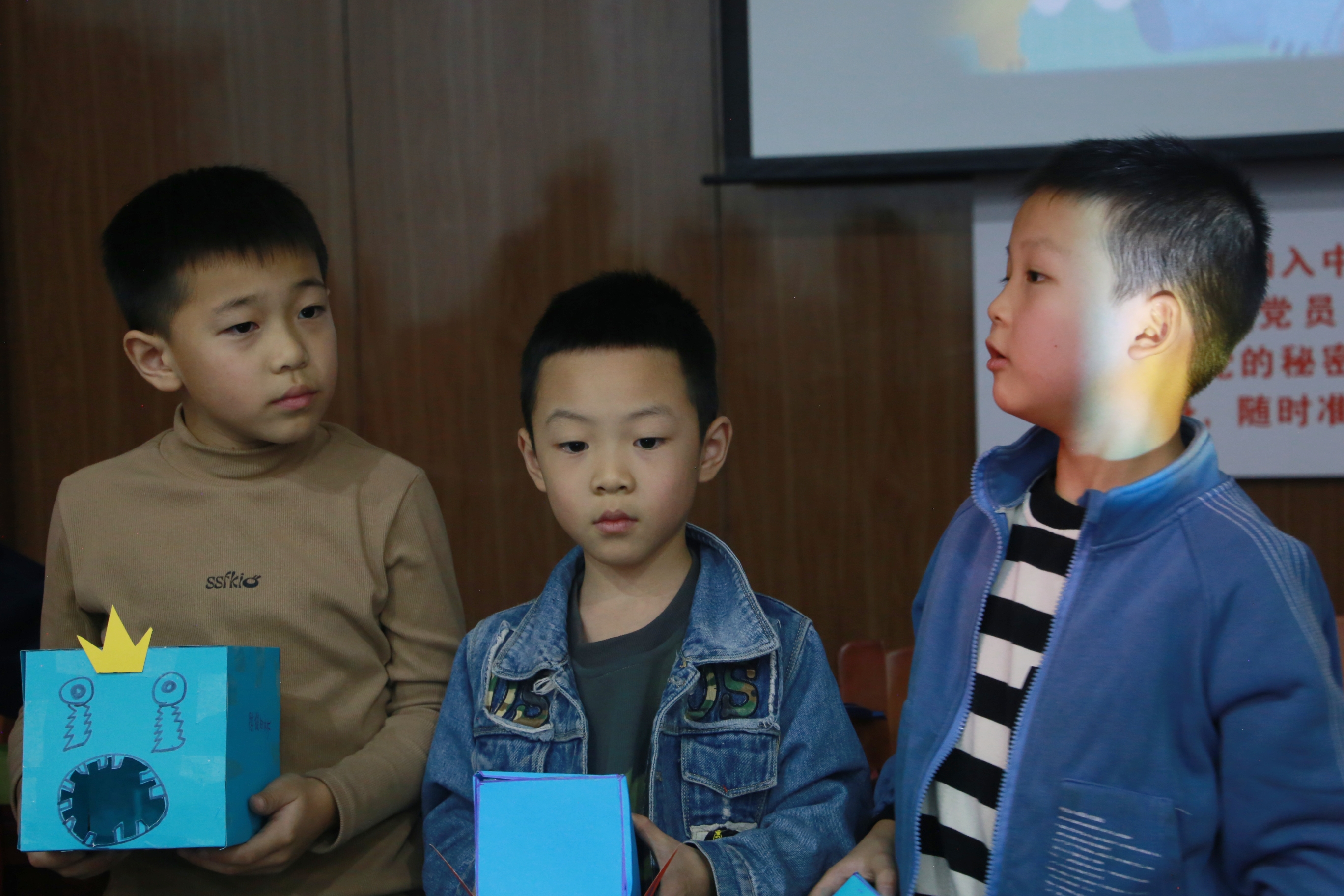 巧手折叠情绪盒,童心珍藏温暖意。手工制作环节将活动推向高潮。在志愿者们的悉心协助下,孩子们充分发挥想象力,动手制作独具特色的"情绪收藏盒",现场氛围温馨而有序。他们巧妙运用各种手工材料,将抽象的情绪转化为具象的艺术作品。在这样的氛围下,小朋友们的分享环节到来,台上充满了童言稚语,台下凝聚着伙伴们的赞许目光,而这每一件作品中都承载着孩子们真实的情感与创意。这个过程不仅锻炼了孩子们的动手能力,更让他们在创作中学会表达和理解自己的情感,