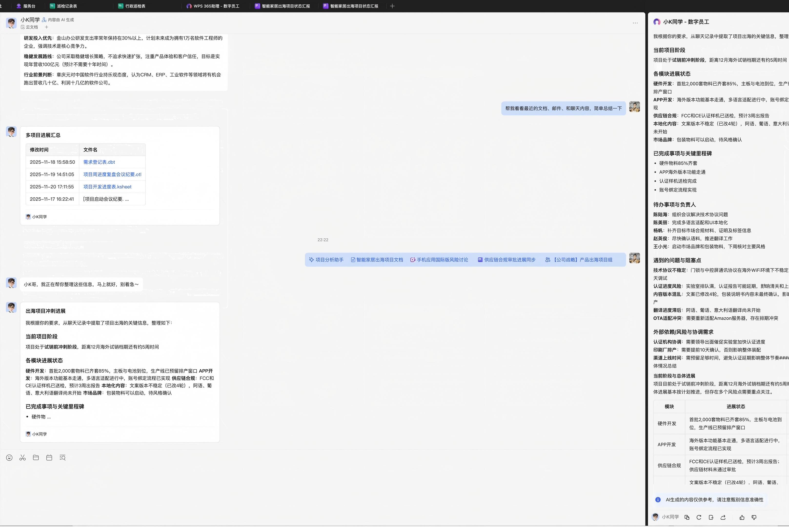此前,WPS 365的AI助手能力已经嵌入文档、邮件、会议等协同办公组件,辅助用户撰写各类文档,校对和翻译邮件内容,生成会议纪要和待办事项。数字员工、智能文档库等AI产品的升级,以及WPS灵犀企业版、团队空间、AI中台等产品的推出,再次增强WPS 365激活企业全域知识的能力。