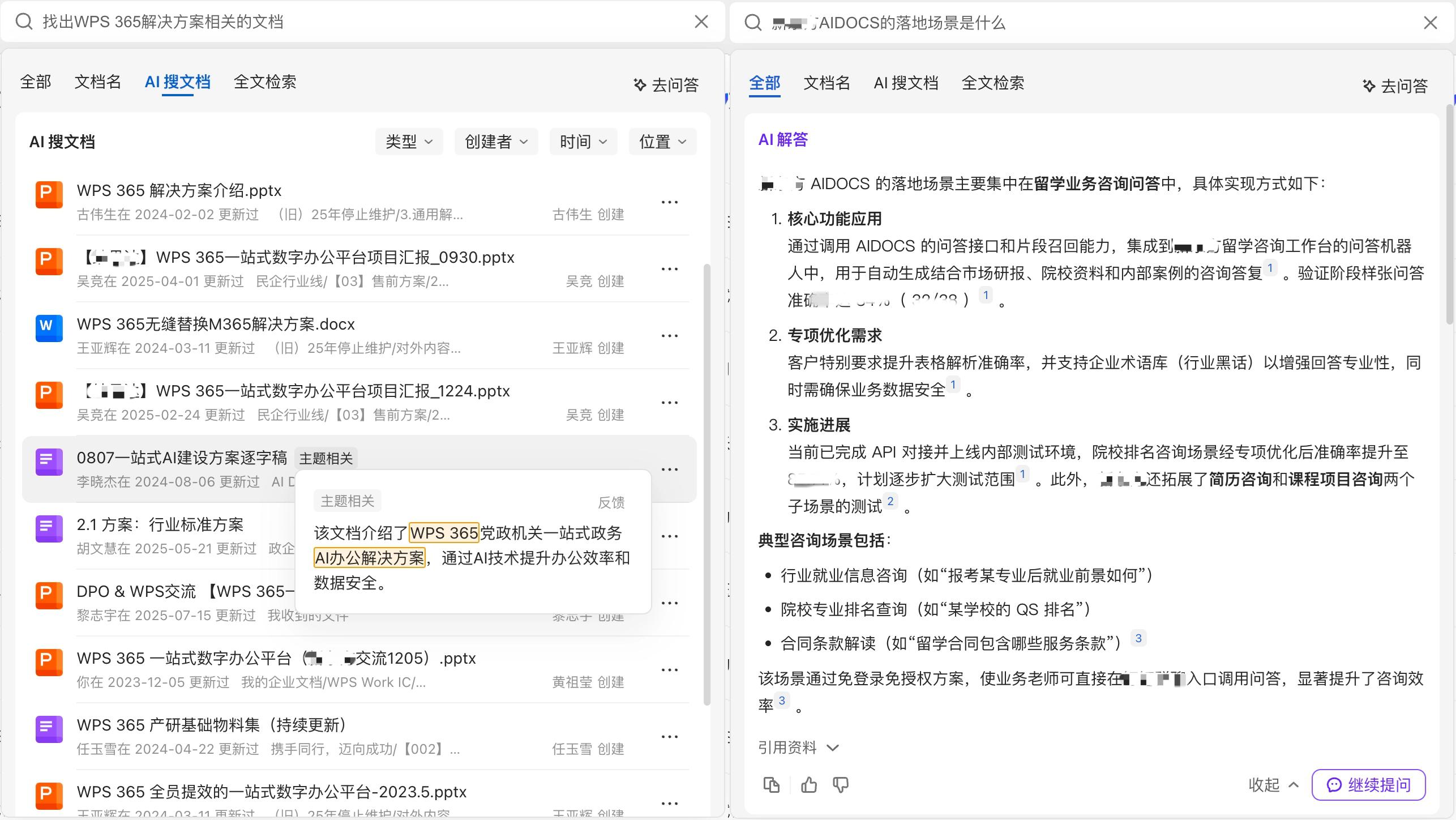 其最新推出的智能搜索支持基于全部云文档的知识检索,核心包括两大实用能力:AI解答可根据问题自动检索匹配的内容并输出答案,适用于快速获取事项关键信息、查询业务关键数据、新人查询规章制度等场景;AI搜文档能在用户忘记文件名仅记得内容主题时,通过语义匹配找到关联文档,避免“大海捞针”。