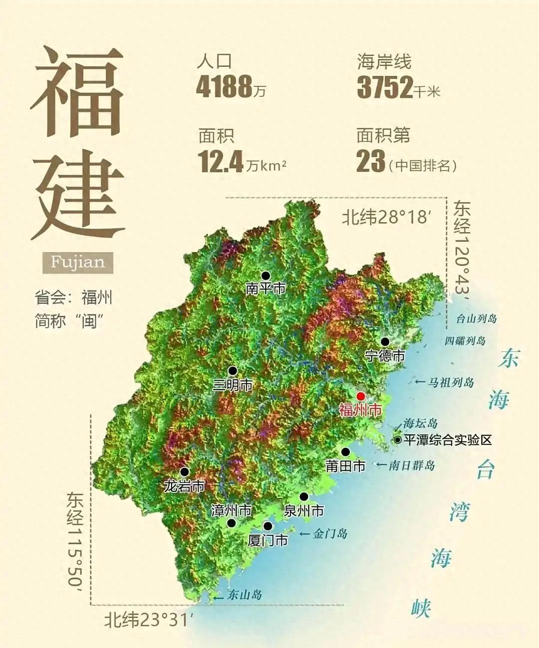 福建省土地面积虽然不大,但因大陆海岸曲折,其大陆海岸线长达3752公里,是大陆第二长省份,同时也是全国海岛数量第二多的省份,海域内自北向南分布有台山列岛、四礵列岛、马祖列岛等众多岛群,岛屿总量约2200座。