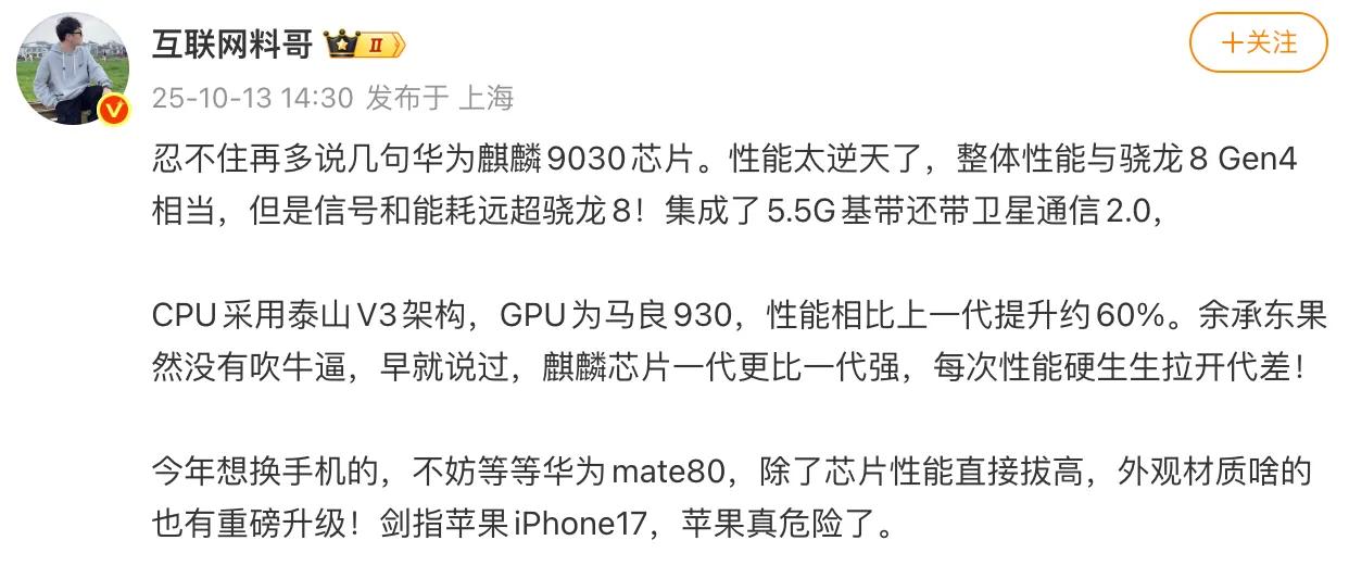 根据第三方爆料,麒麟9030的CPU采用全新一代泰山V3架构,包括1颗3.0GHz超大核、3颗2.5GHz大核和4颗能效核心,在多任务处理与高性能负载场景下,实现了性能与能效的最佳平衡。GPU部分升级为马良930,相较上代性能提升约60%;达芬奇NPU算力单元突破40TOPS;支持全新5G-A基带,在信号稳定性与功耗控制方面都有全面进步。整体来看,麒麟9030是华为有史以来最强的自研芯片,或将重新定义国产自研芯片体验上限。