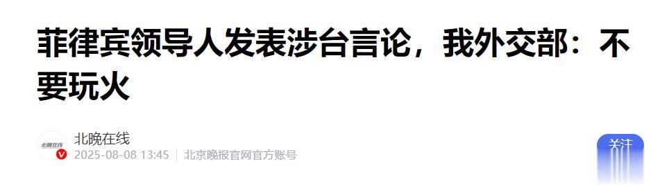 北晚在线2025-08-08:《菲律宾领导人发表涉台言论,我外交部:不要玩火》