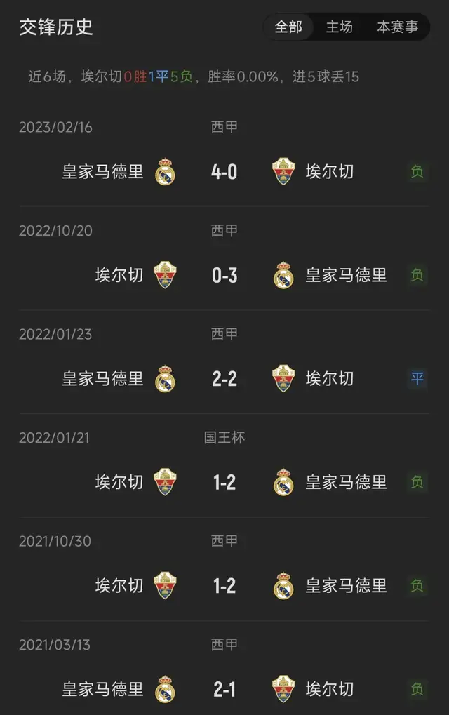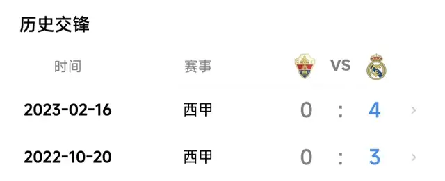 皇马历史上53战埃尔切取得35胜12平6负,其中近17战取得14胜3平,且过去23战只输1场比赛。