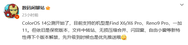 系统体验方面据博主数码闲聊站爆料,全新ColorOS 14将上线文件中转站、无损压缩合并、闪回窗、自由小窗等新特性。至于交互层面,文件中转站功能还能够与自由小窗进行丝滑联动,看来此次ColorOS 14在高效交互这块又有新突破了。#创新看OPPO#