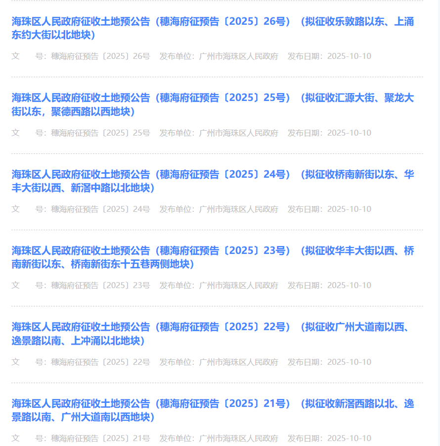 另外,目前赔偿方案暂未确定,大家可以自行猜猜......但大概率会参考海珠新中轴的赔偿方案,宅基地一户一宅最高280平,弃产最高补偿2.5万元/㎡。除了石溪外,这个月海珠连发11宗征地公告。主要分布在广州新中轴的东风村及三滘村,合计征收超18公顷,拟征收土地用途均为成片开发建设需要用地。