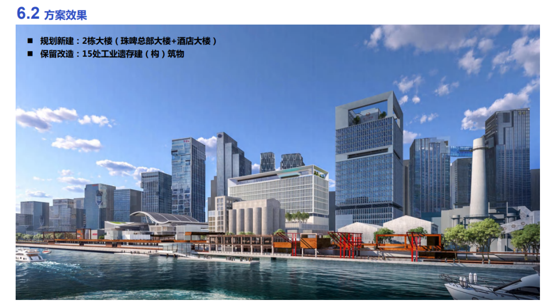 报告显示,项目将依托独有的啤酒厂建筑特色及啤酒文化,打造具有工业特色的城市文化地标。规划新建2栋大楼,分别为珠啤总部大楼和酒店大楼。