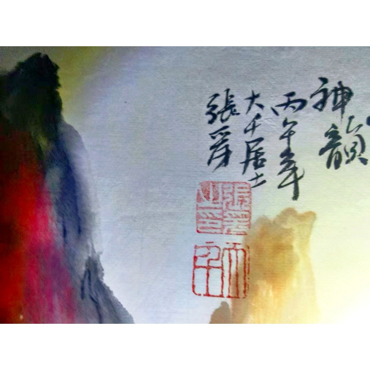 五、人文价值:艺术与时代的终极史诗这幅《江山揽胜》是 **“近现代中国山水画革命” 的活态史诗 **—— 它是张大千 “艺术晚年变法” 的封神之作(泼彩技法是其艺术创新的巅峰,打破了传统山水的边界)、中国山水画 “从传统走向现代” 的标志性作品(将西方艺术语言与中国传统精神完美融合)、东方艺术 “对话世界艺术” 的文化象征(在全球艺术市场获得高度认可,成为中国艺术的国际名片)。从张大千的画室到全球顶级拍卖行,它见证了中国山水画的现代化进程、艺术收藏的全球化浪潮与文化审美的多元化发展。